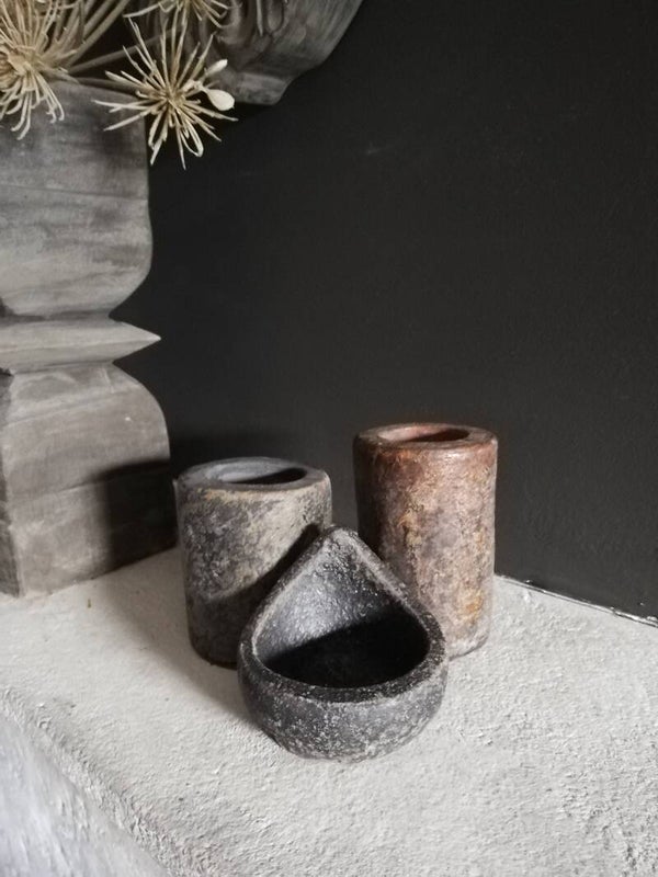 Erg mooie theelichtjes van aardewerk. Ieder theelicht is in bruin/grijs/zwart nuance, geen is hetzelfde