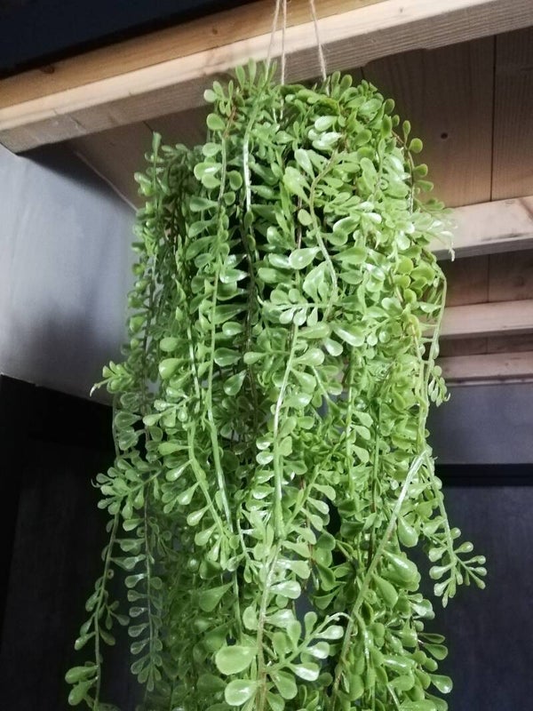 Deze goed gevulde hangplant, hangt aan een zwarte bol.