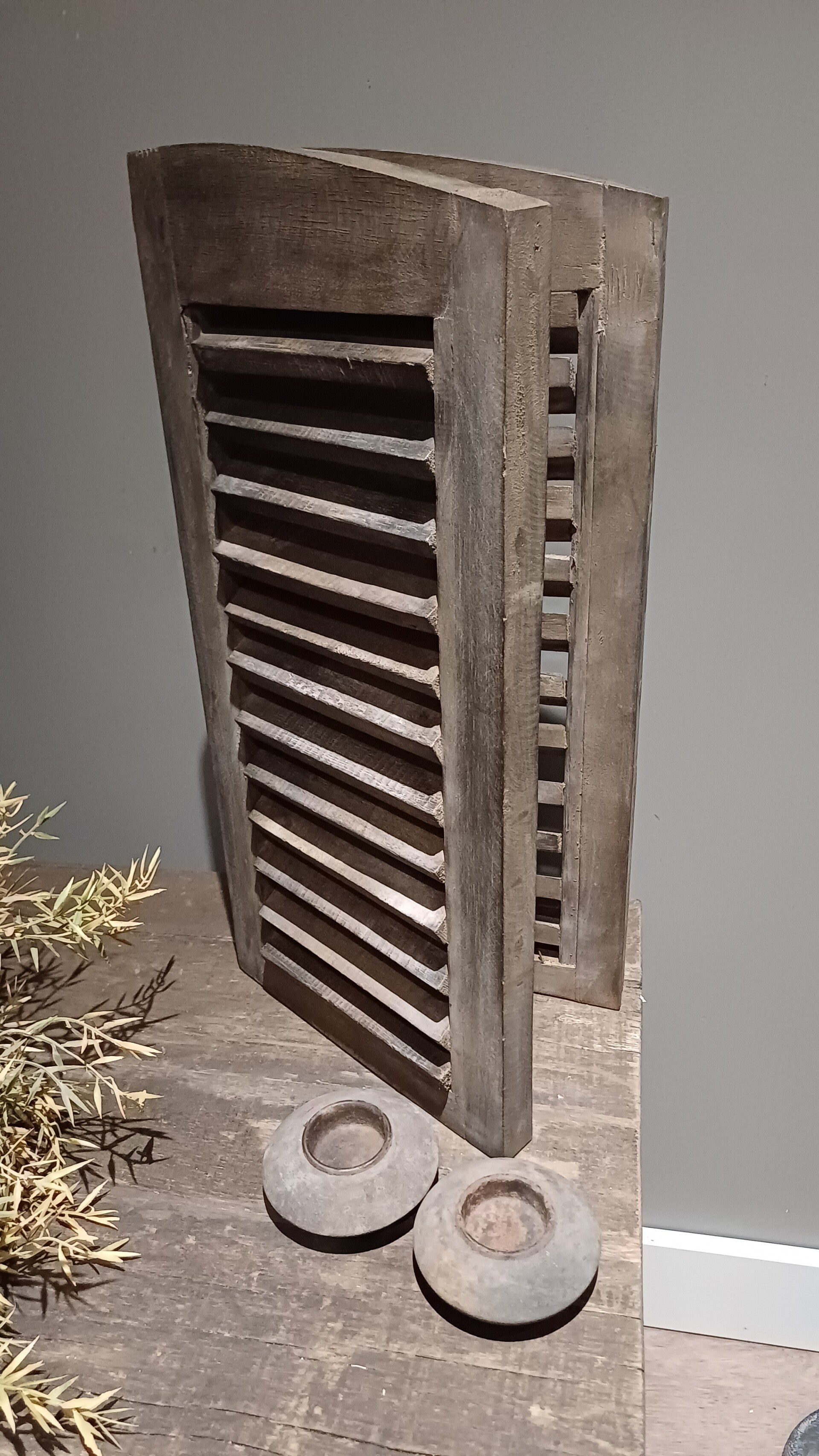 Louvre luikje 2 delen uitklapbaar. Kun je dus overal plaatsen als decoratie of afscherming. Grey wash van kleur ( kleur kan afwijken van foto)