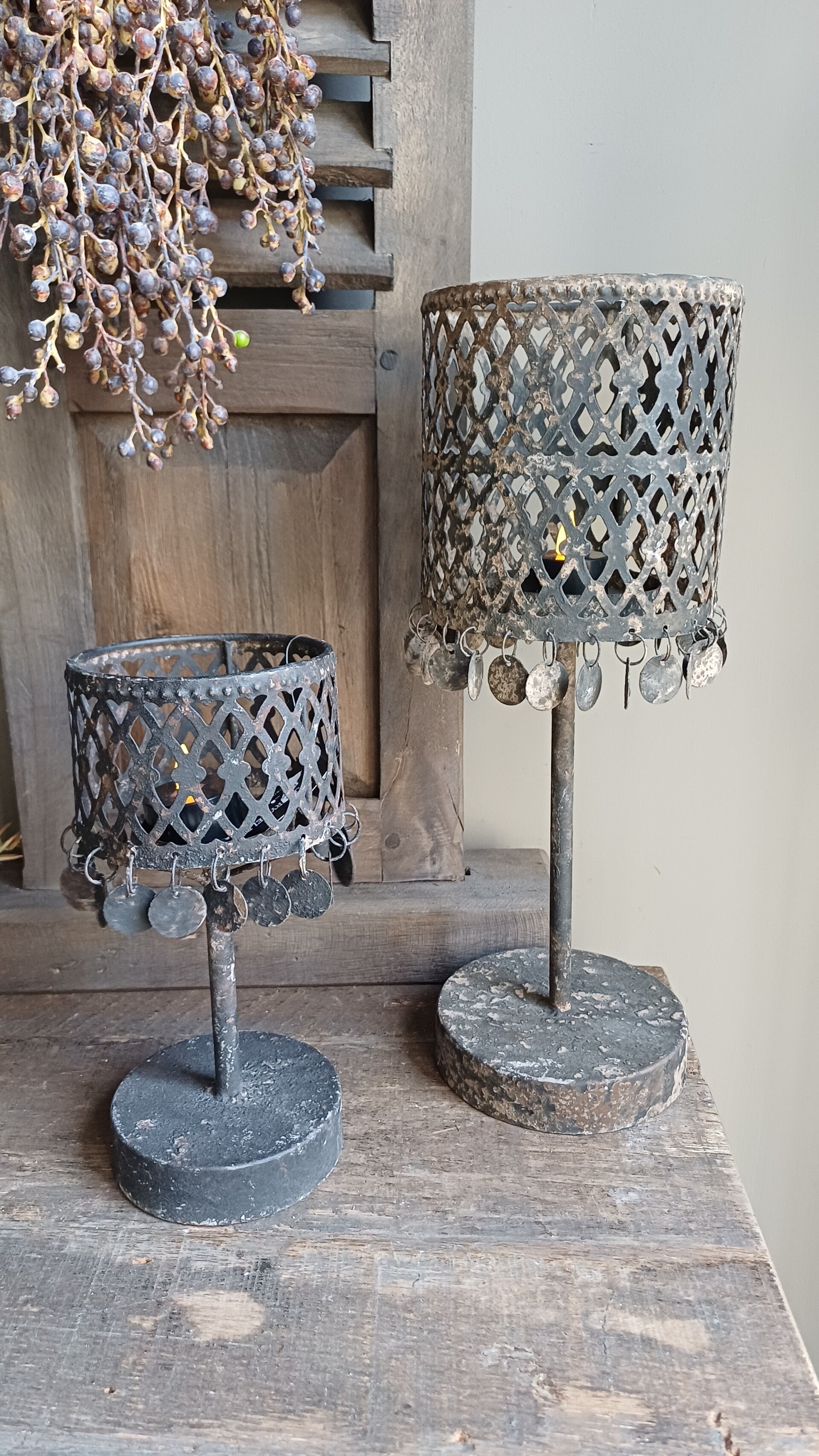 Breng warmte en sfeer in huis met deze metalen kandelaar met muntjes. De opengewerkte details en decoratieve muntjesrand zorgen voor een speels en elegant effect, terwijl de warme bruine kleur en verweerde afwerking de kandelaar een authentieke, landelijke uitstraling geven.