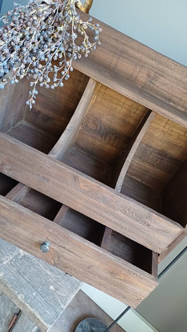 Gruttersbak 3 vakken met lade waarin 4 vakjes zitten. Landelijke robuuste uitstraling in zware uitvoering met oneffeheden voor het juiste karakter. (kleur kan afwijken van foto)