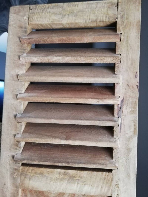 Stoer louvre luik op voet. Deze is een robuuste uitvoering met de gebruikelijk oneffeheden zodat het luik een stoere look krijgt.
