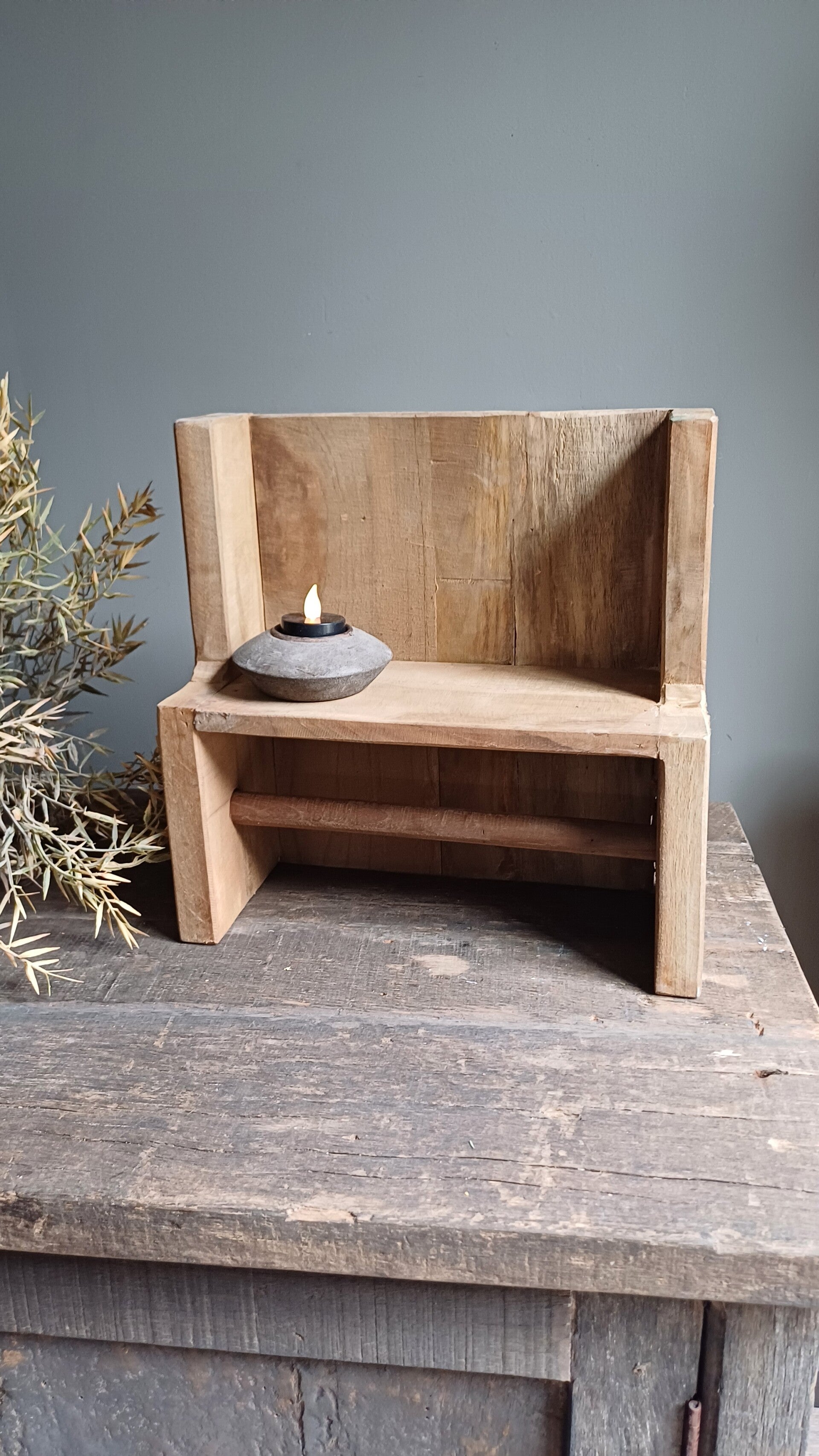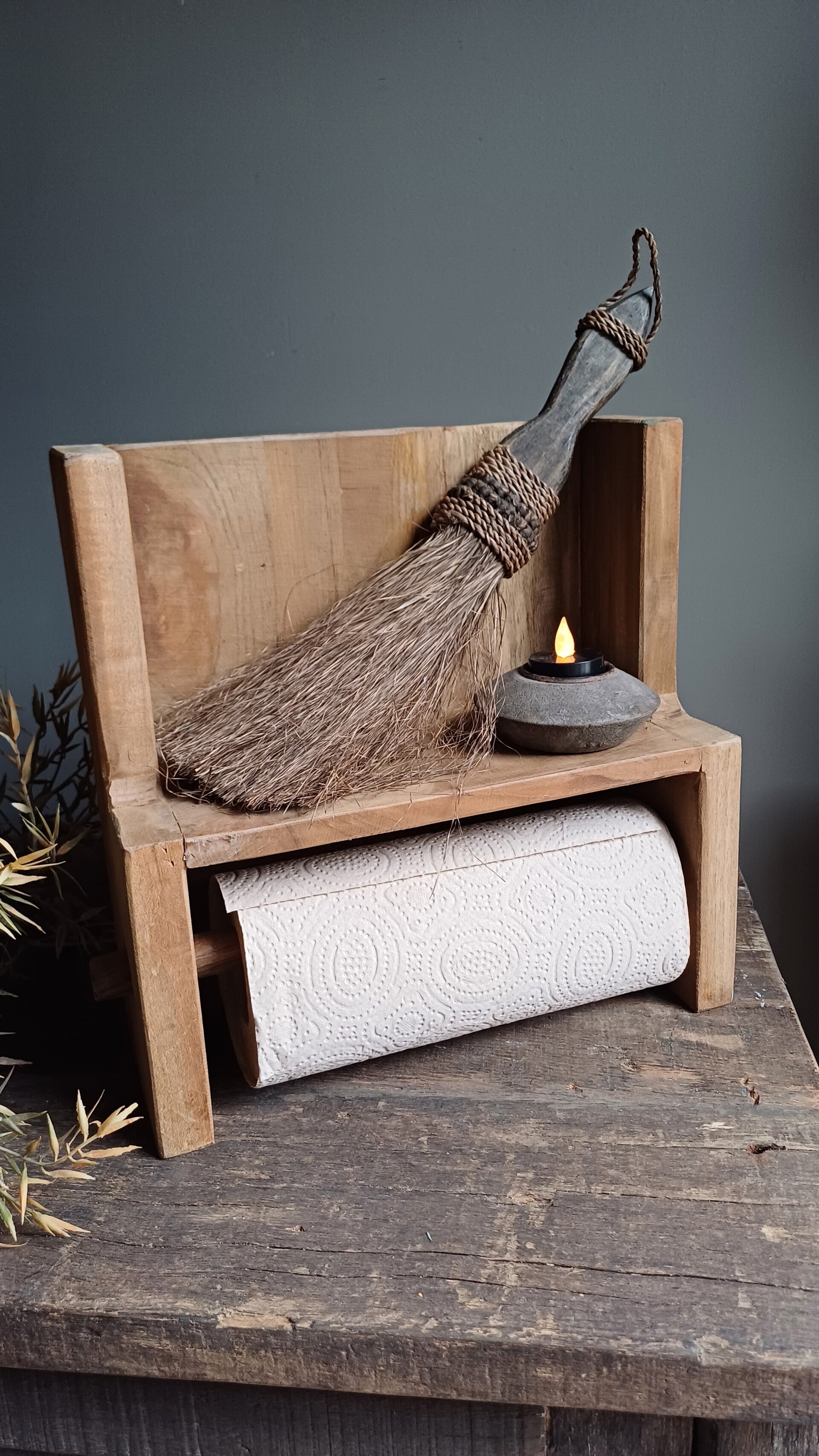 Deze landelijke houten keukenrolhouder zitten haakjes aan de achterkant om hem op te hangen. Ook een schap aan de bovenkant om leuke decoratie of kruiden op te zetten.