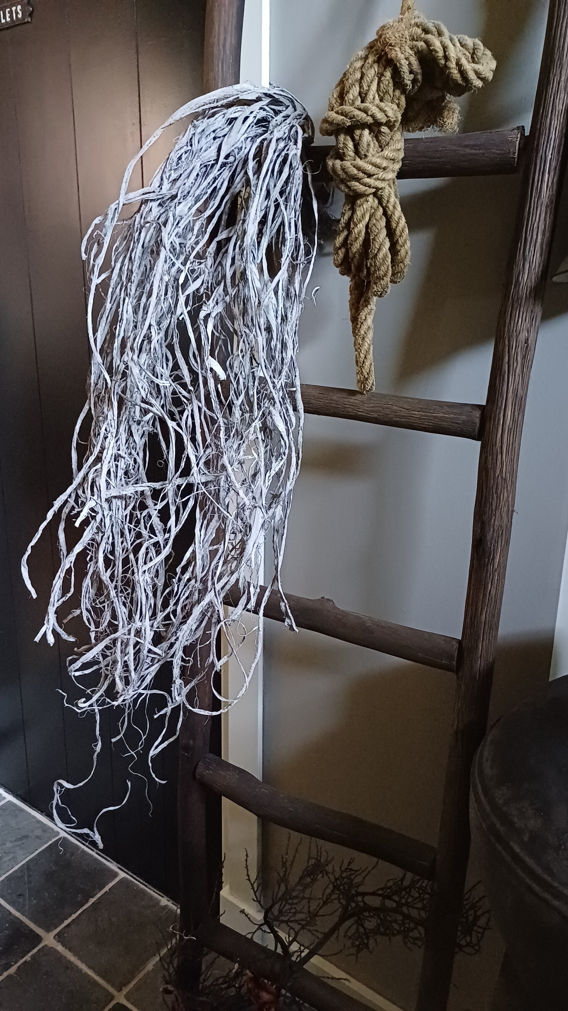 Raffiabundel om op te hangen, neer te leggen op een vaas of ter decoratie te gebruiken. Het materiaal heeft een stevige structuur. Ook heel gemakkelijk om de touwtjes uit elkaar te halen en om een ring te binden om zo een krans te maken.