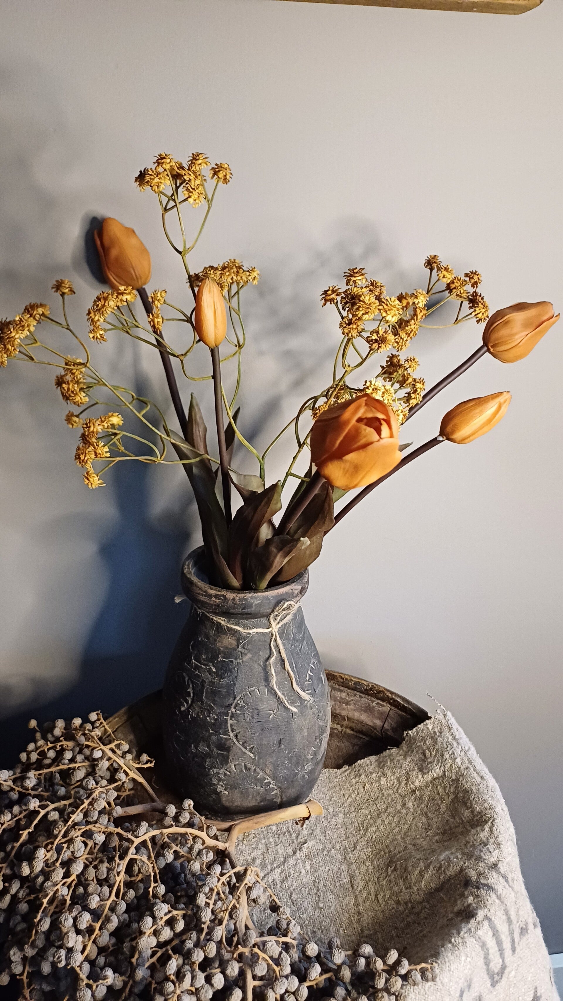 Deze kunst tulpen zijn niet van echt te onderscheiden in gewicht- en gevoel niet. Hoe mooi tulpen ook zijn ze zijn meestal binnen een week uitgebloeid. Dit is de ultime oplossing. Erg apart met de donkere steel en bladeren.