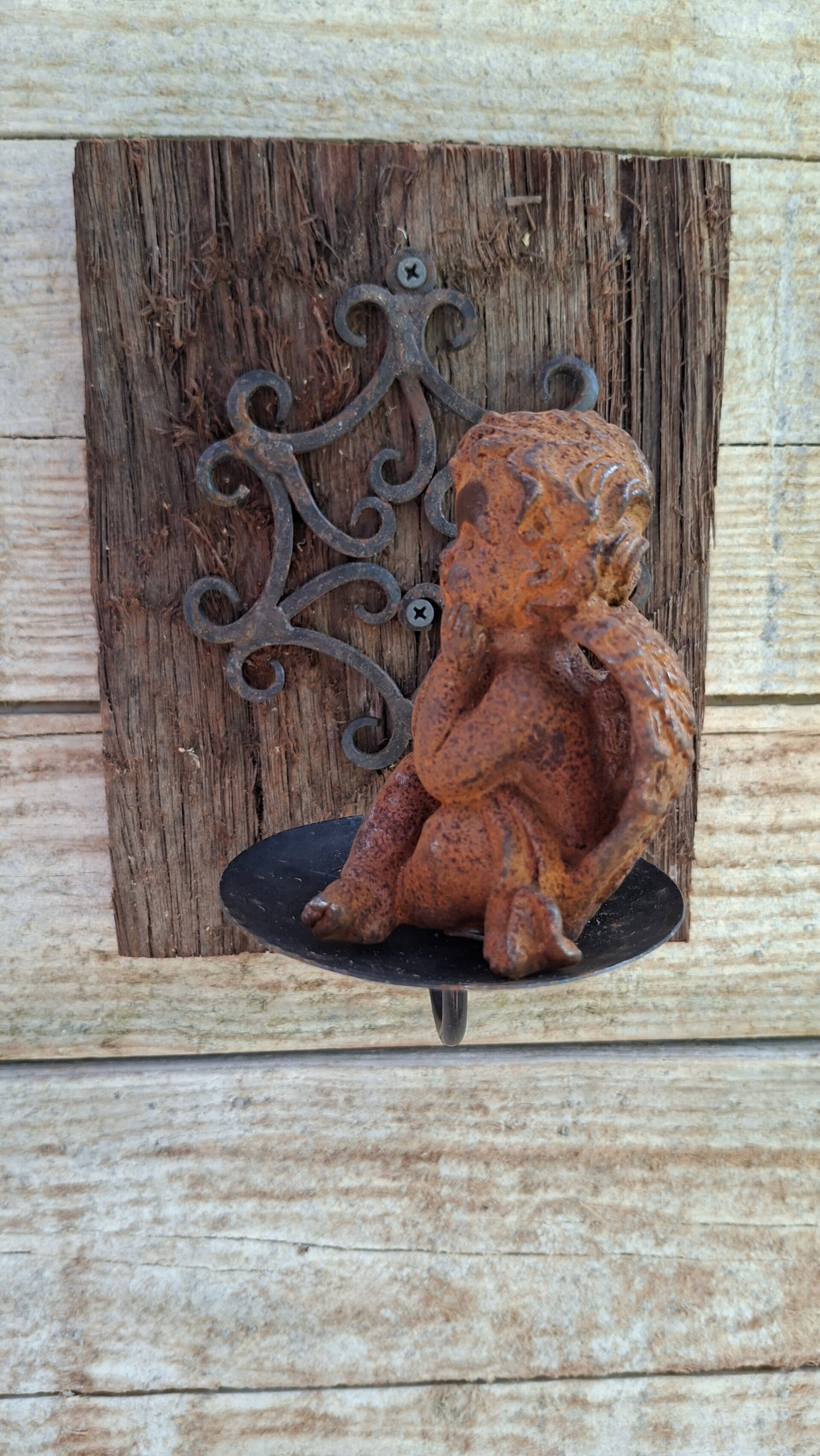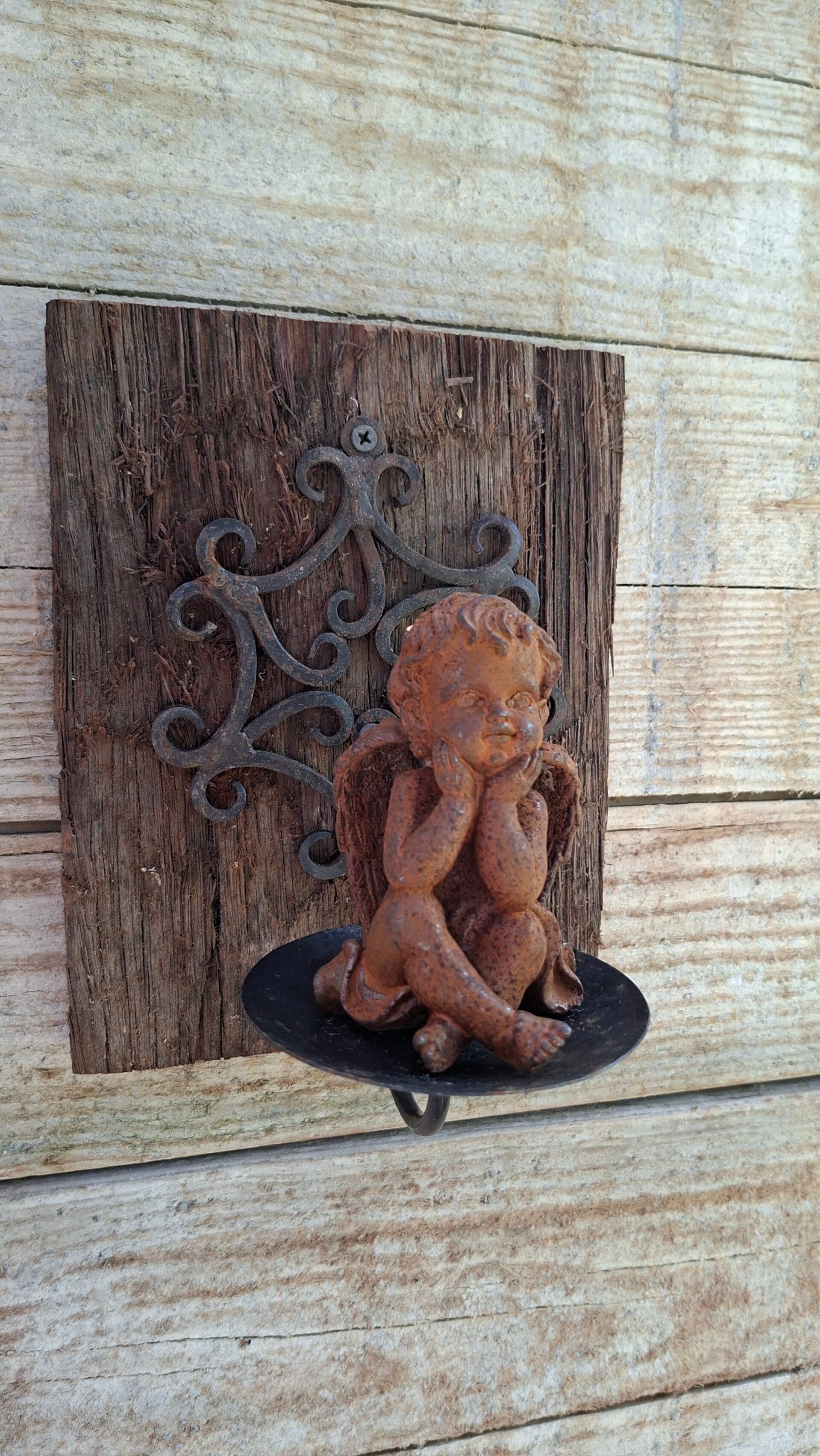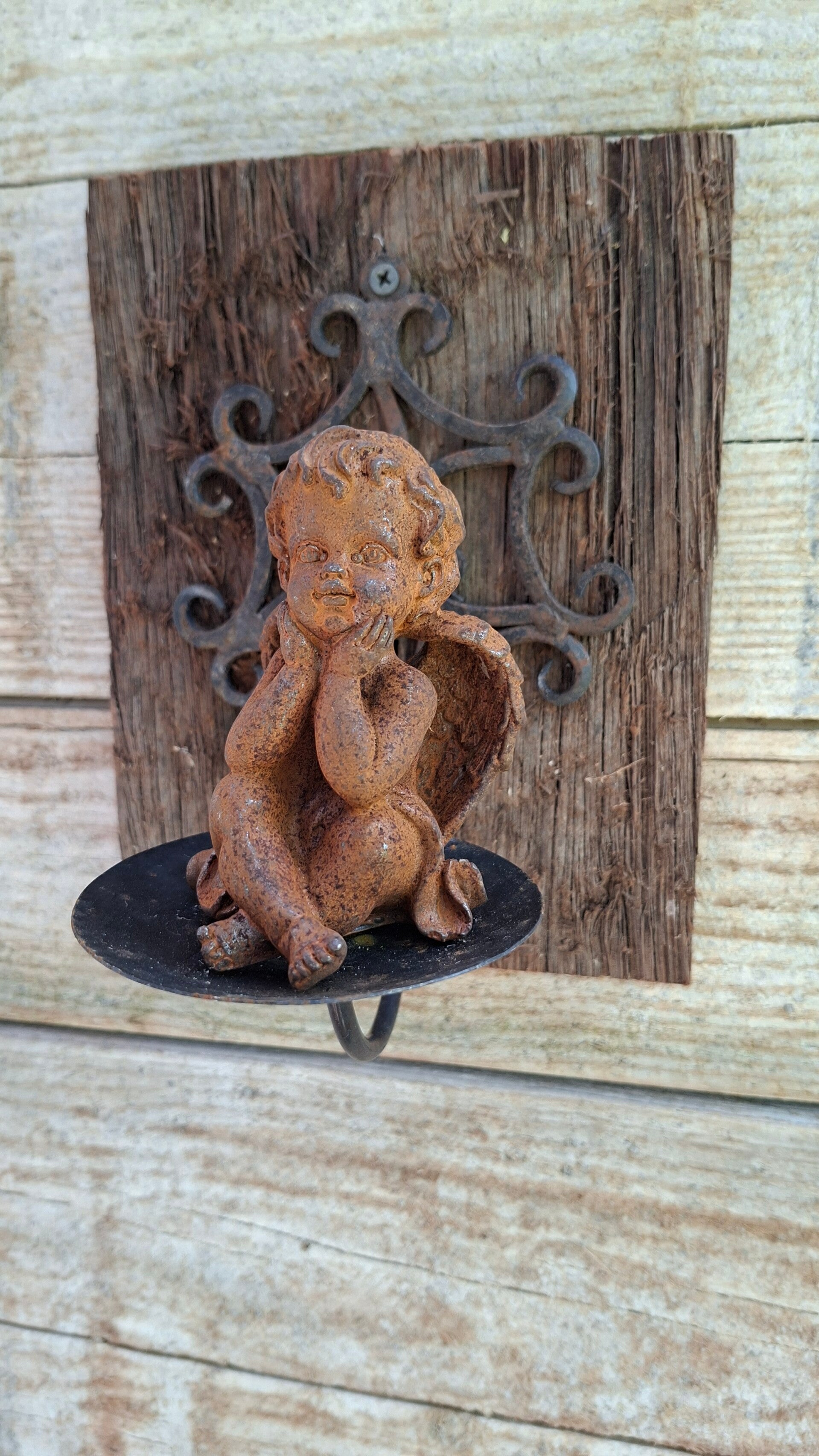 Erg mooi lief klein engeltje van zwaar roestig gietijzer. Hoofd in haar handjes.