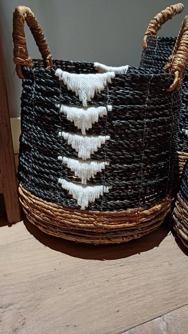 S D22H25cm met oor H35M D25H32cm met oor H40cmL D35cmH38cm met oor H50cmStevige manden set van diverse soorten grassen met leuk macrame detaile