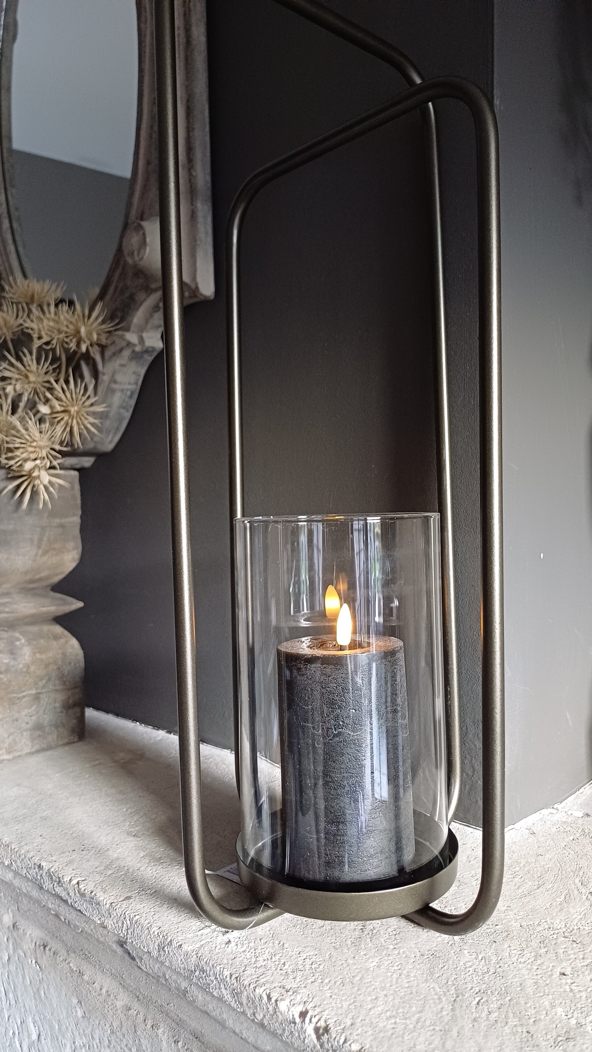 Stoer en grafisch is deze metalen lantaarn. Er kan een stompkaars in het glas, maar ook zonder is het een uniek object! De rechthoekige metalen frame zorgen voor een stoere en industriële uitstraling. Maat: 50cm hoog/21,5 breed (frame)11,5x20cm glas