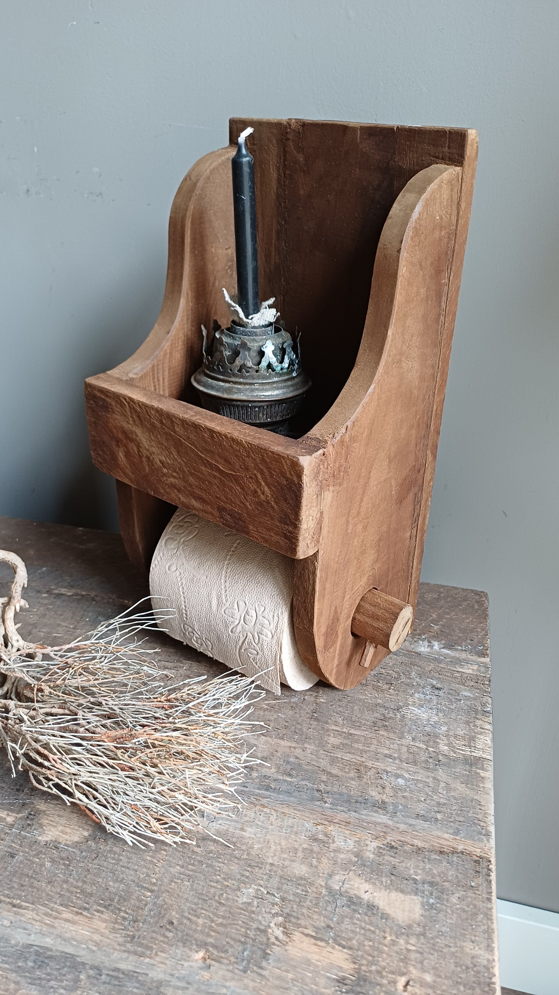 Super leuke toiletrolhouder van robuust hout, erg mooi om een geur kaarsje of amberblokje bovenop te leggen. Aan de achterkant 2 haakjes om hem op te hangen.