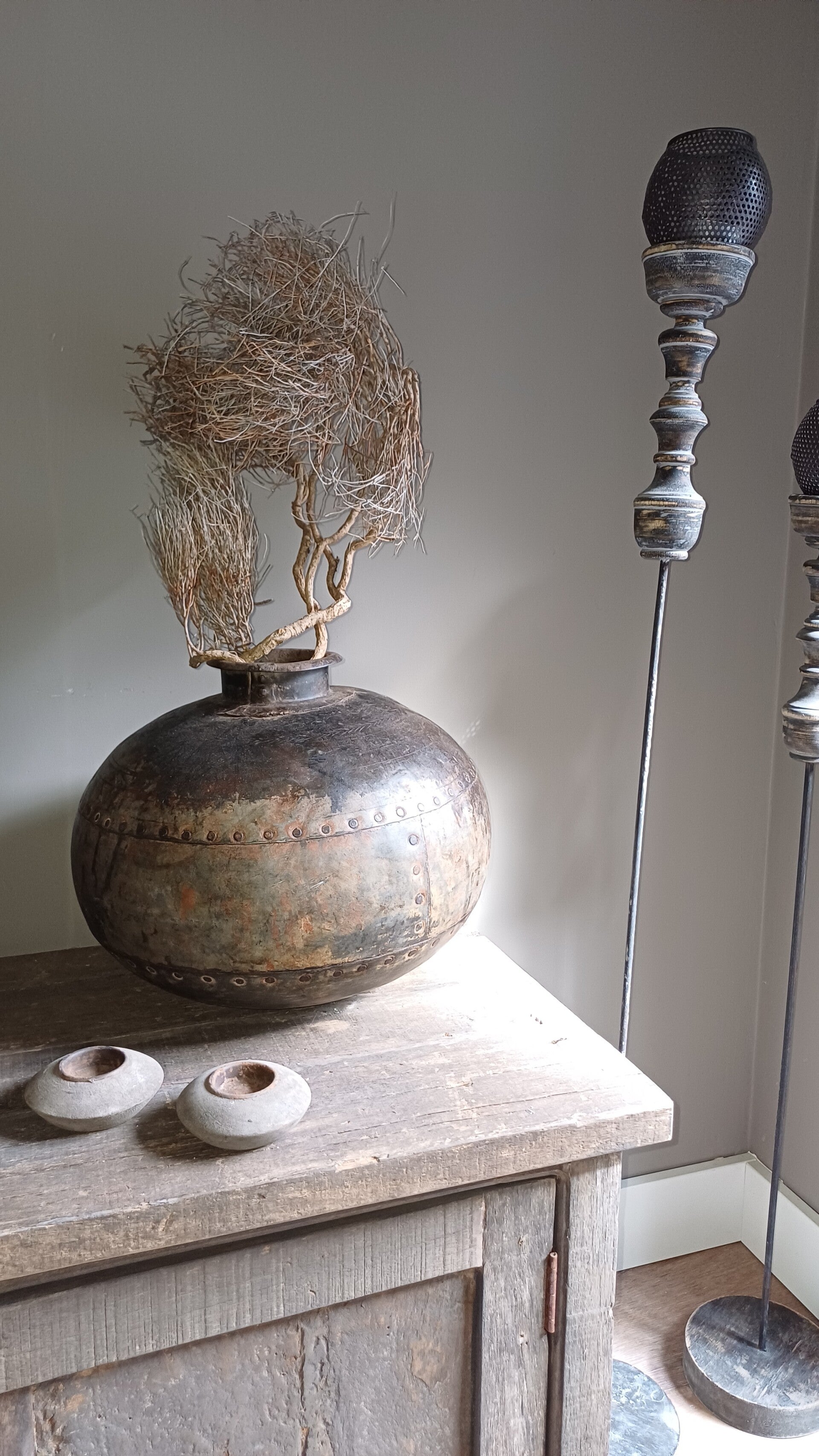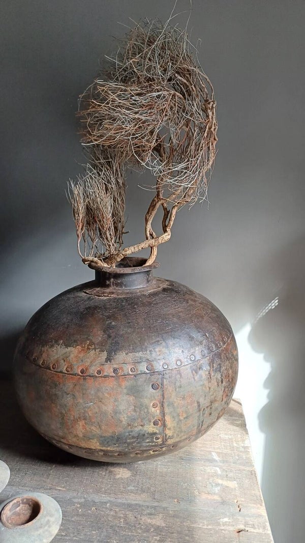 Super gave grote metalen bolle waterpot. Iedere waterpot is uniek waardoor ze uniek zijn. Deze is wat bruiner van kleur met een lichtere bolle buik er kan een deukje inzitten.
