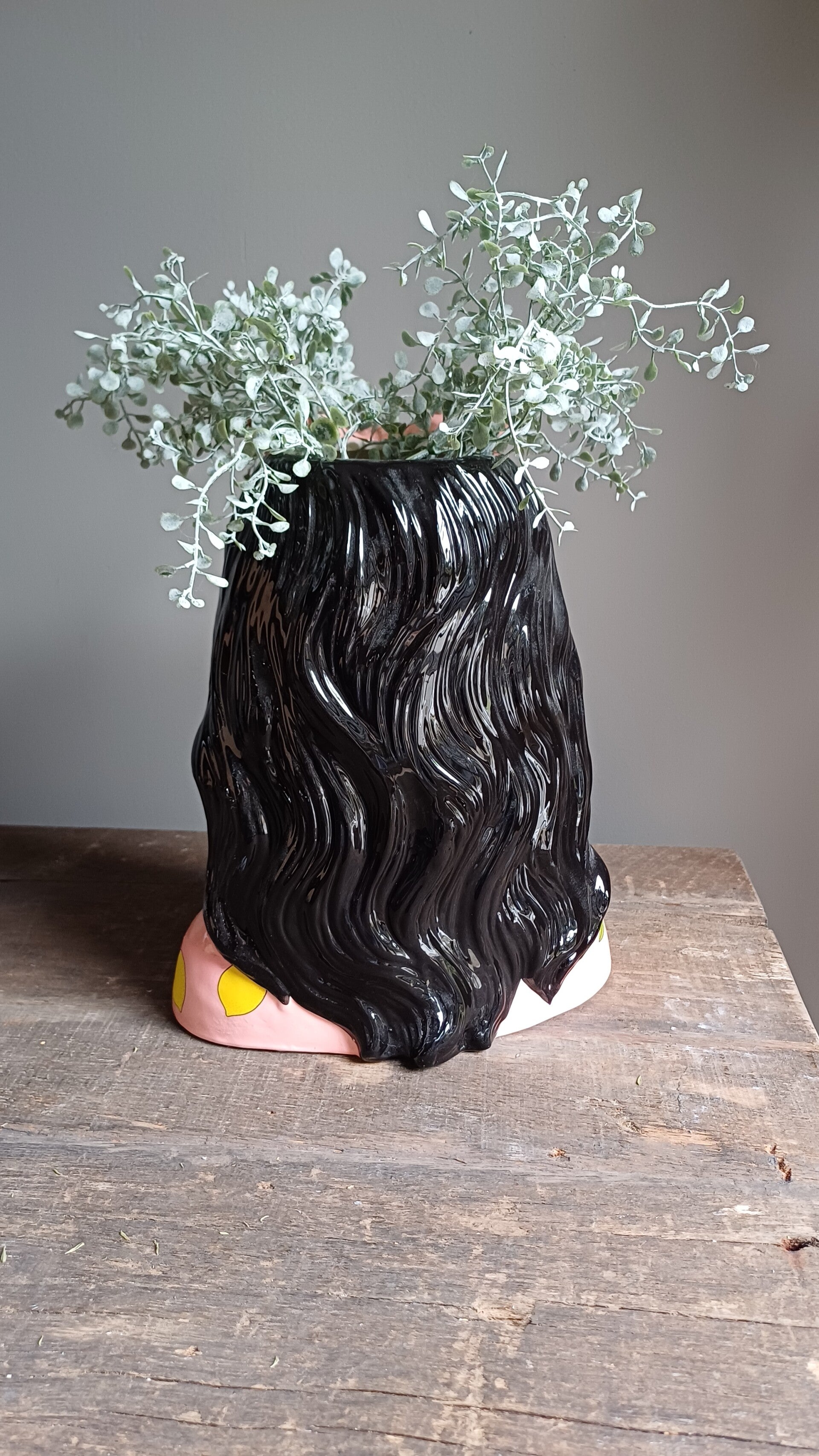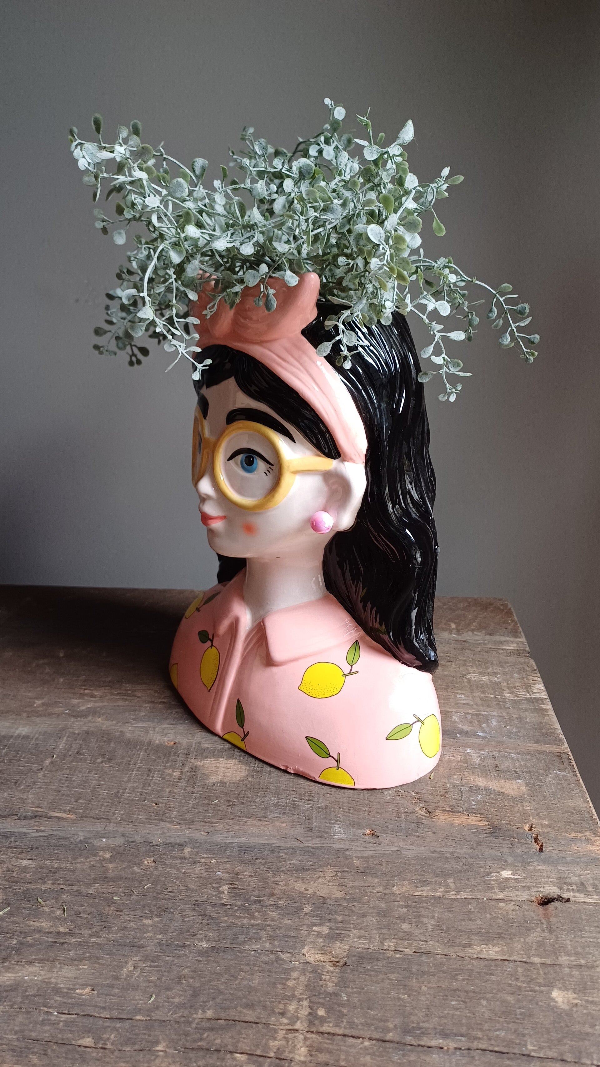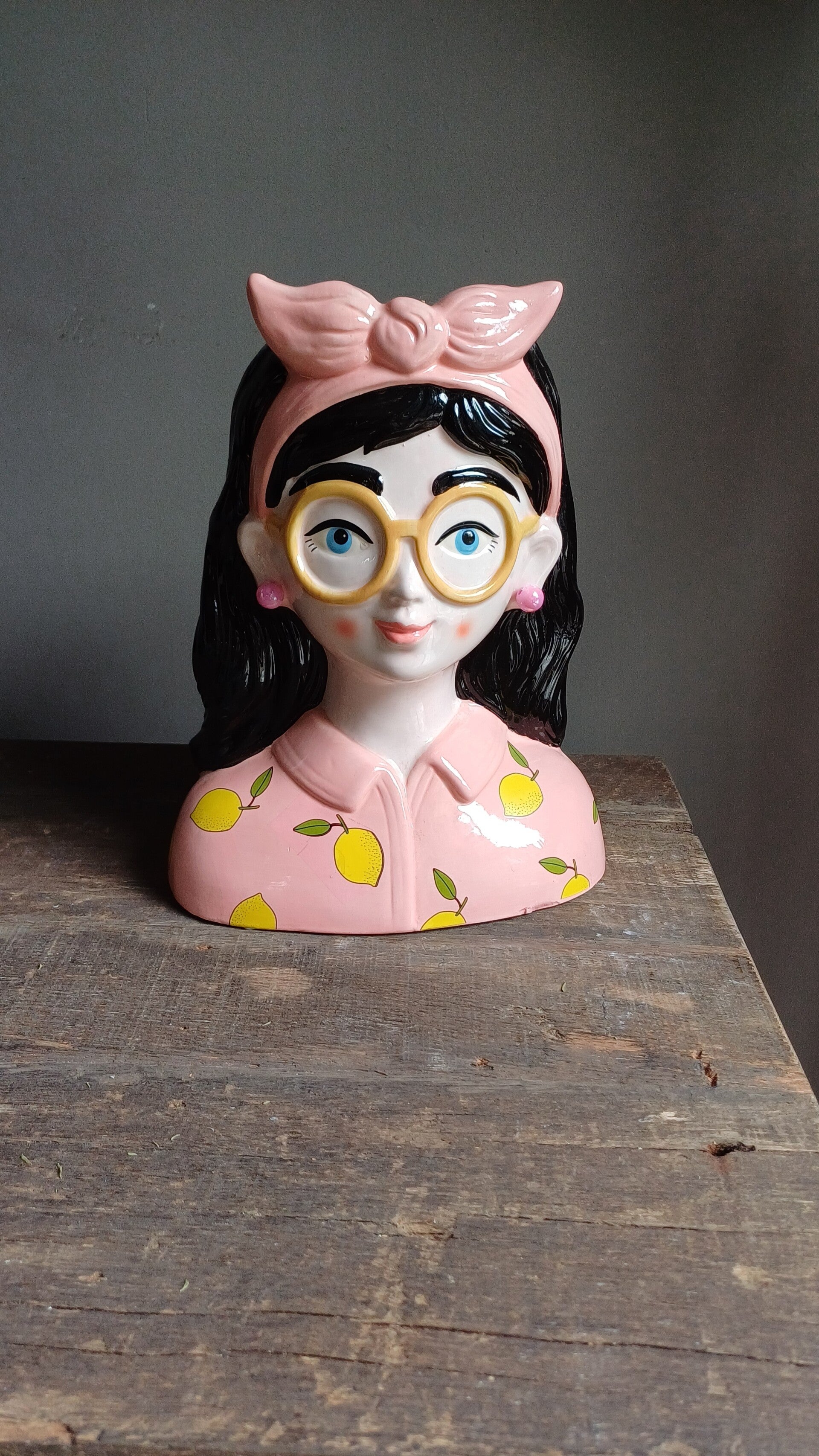 Maak je interieur fleurig ruimte met deze unieke en charmante vaas. Met haar roze blouse en gele ronde bril brengt ze een speelsheid en een vintige karakter in elke kamer. Erg decoratief en functionele vaas voor je favoriete bloemen of plantje. Tover een glimlach bij je vrienden.