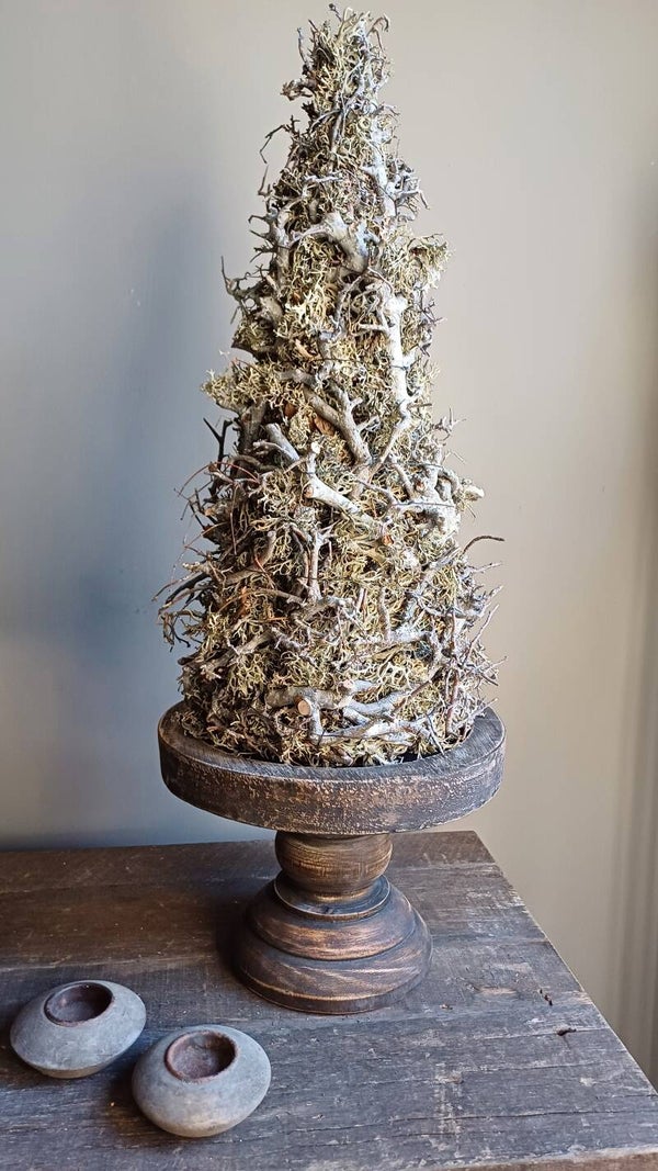 Plateau met voet van hout. Erg mooi met windlicht erop. Landelijke sobere uitstraling met oneffeheden voor het juiste karakter. Ook geschikt voor klein kerst decoratie op te zetten