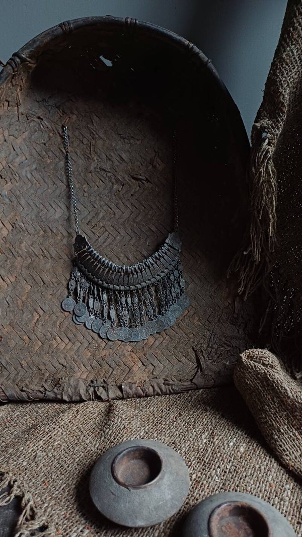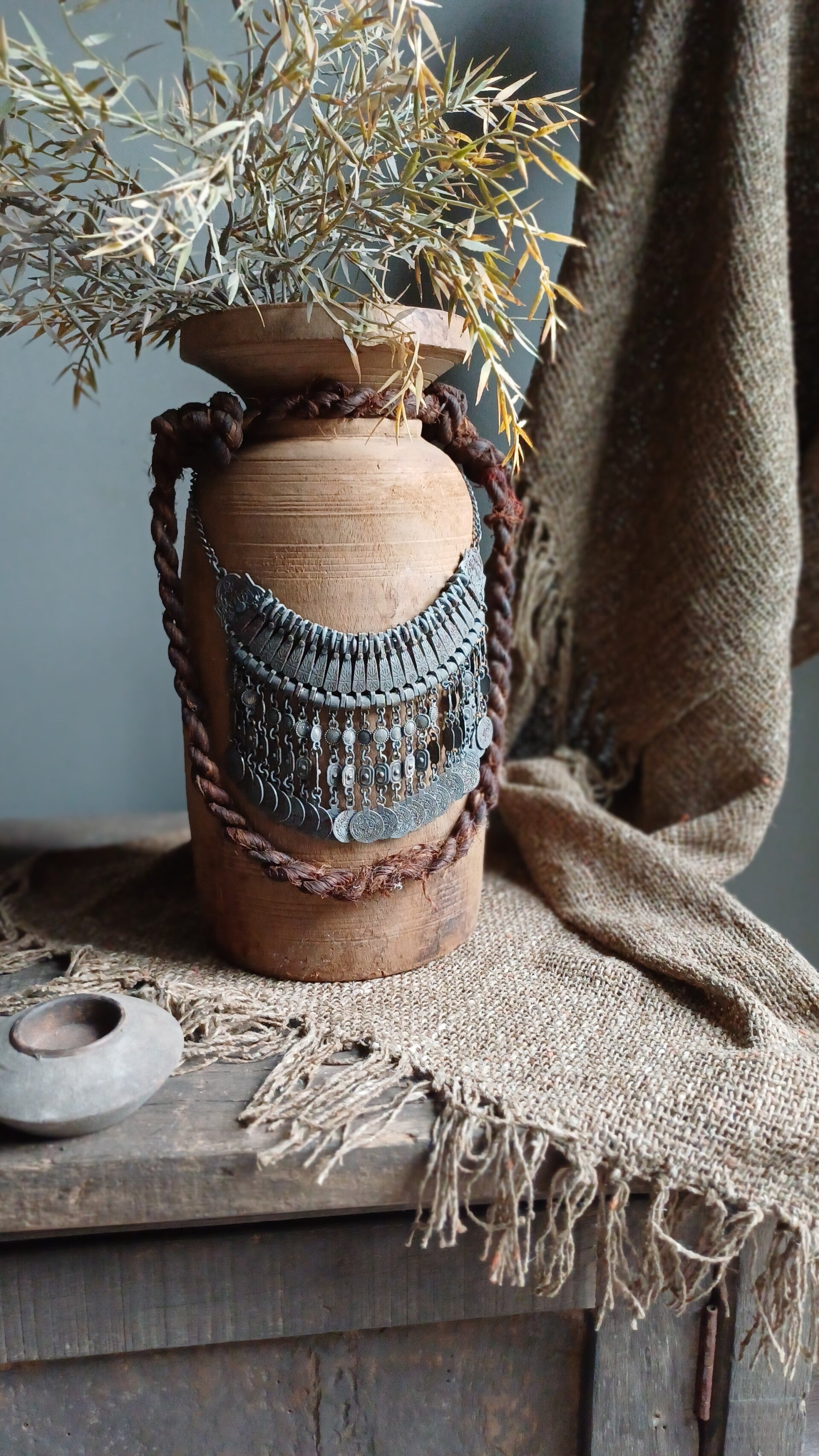 Deze ketting maakt je nepalese kruik, pot of mand helemaal af!Geinspireerd op Marokkaanse ketting(en). De kettingen zijn in lengte verstelbaar d.m.v. een ijzer draadje.