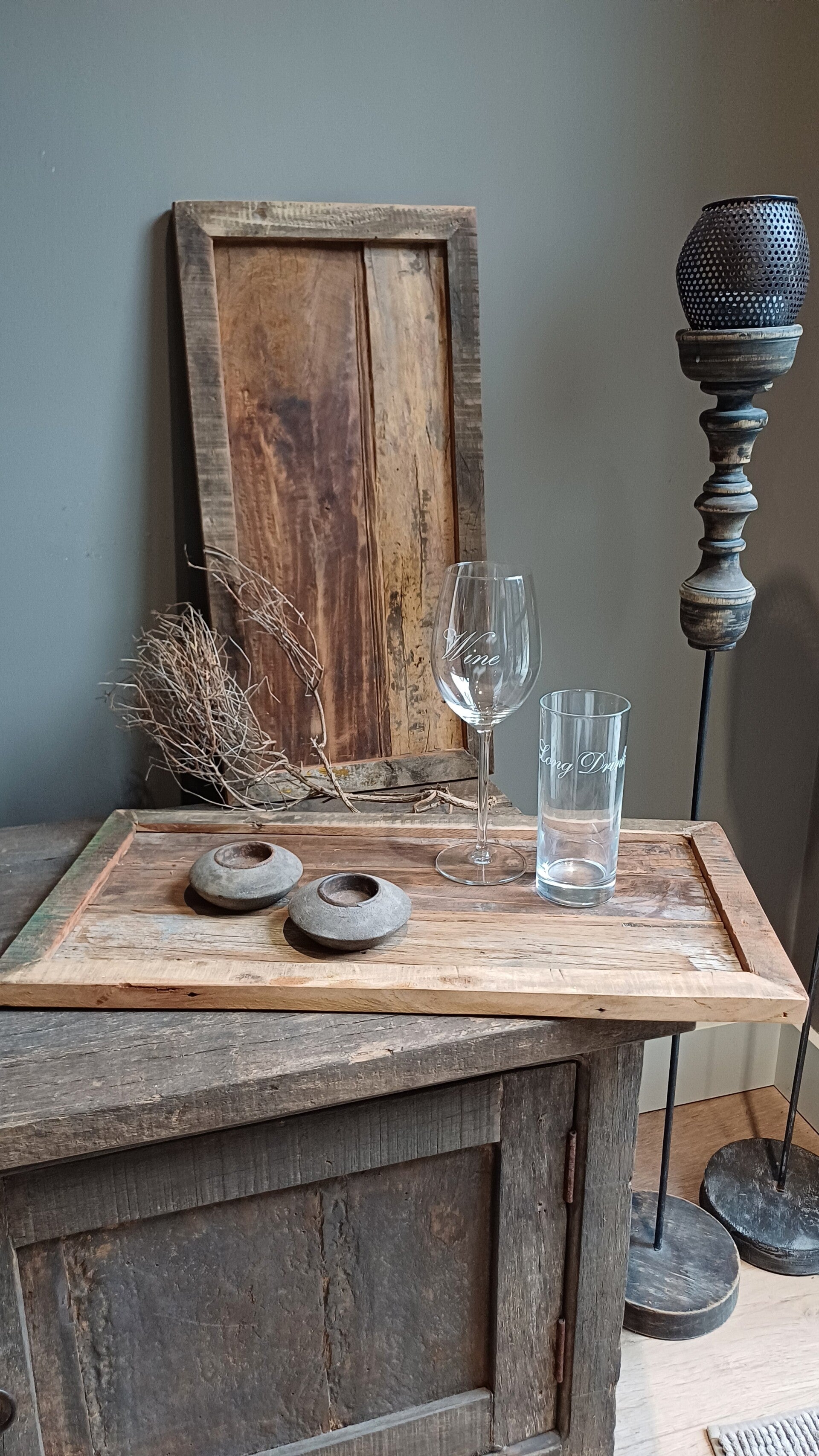 Landelijk industrieel dienblad van robuust hout. Hand gemaakt. Deze dienbladen komen uit onze robuuste colletie en vertonen oneffeheden waardoor het karakter krijgt.