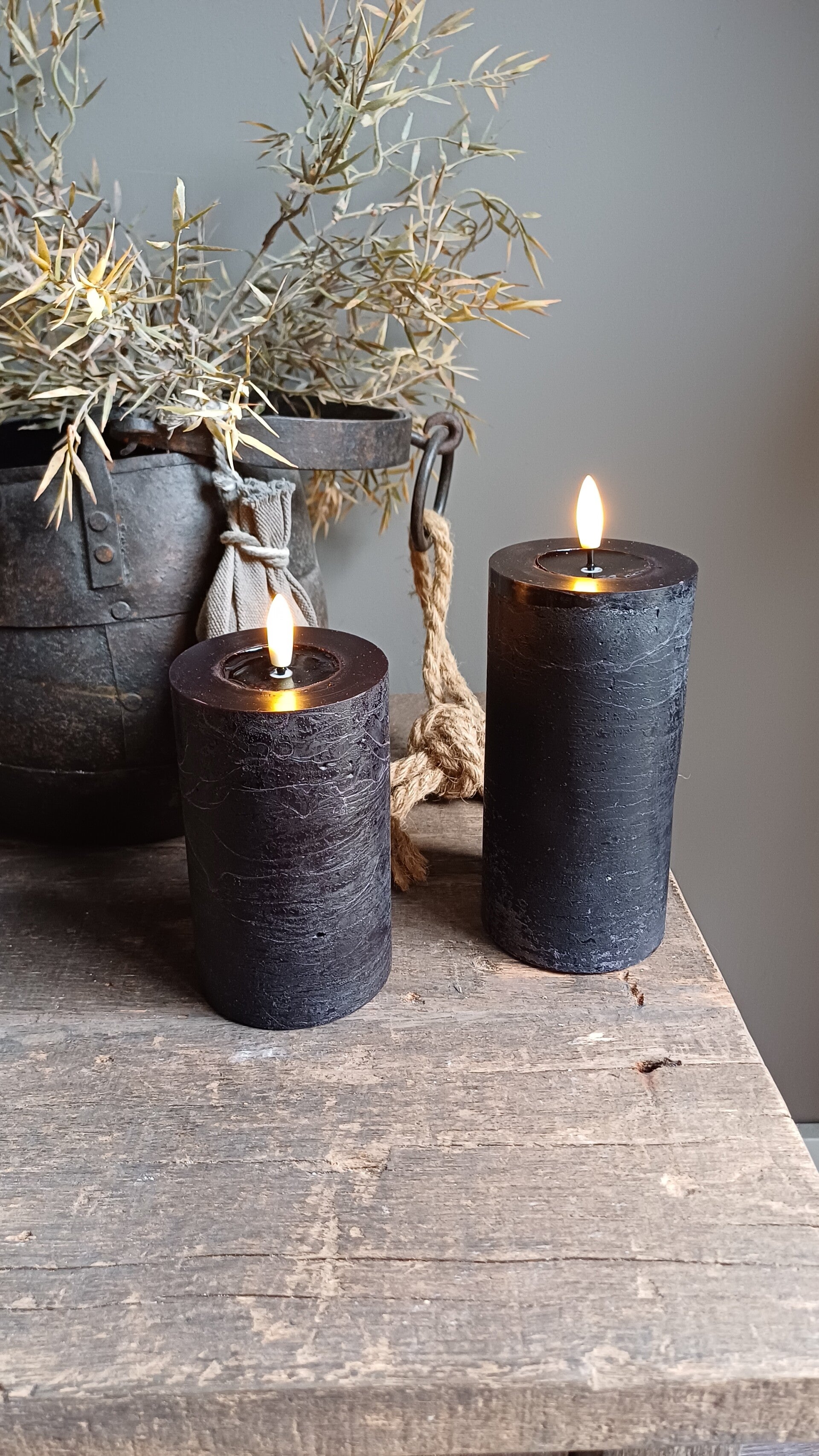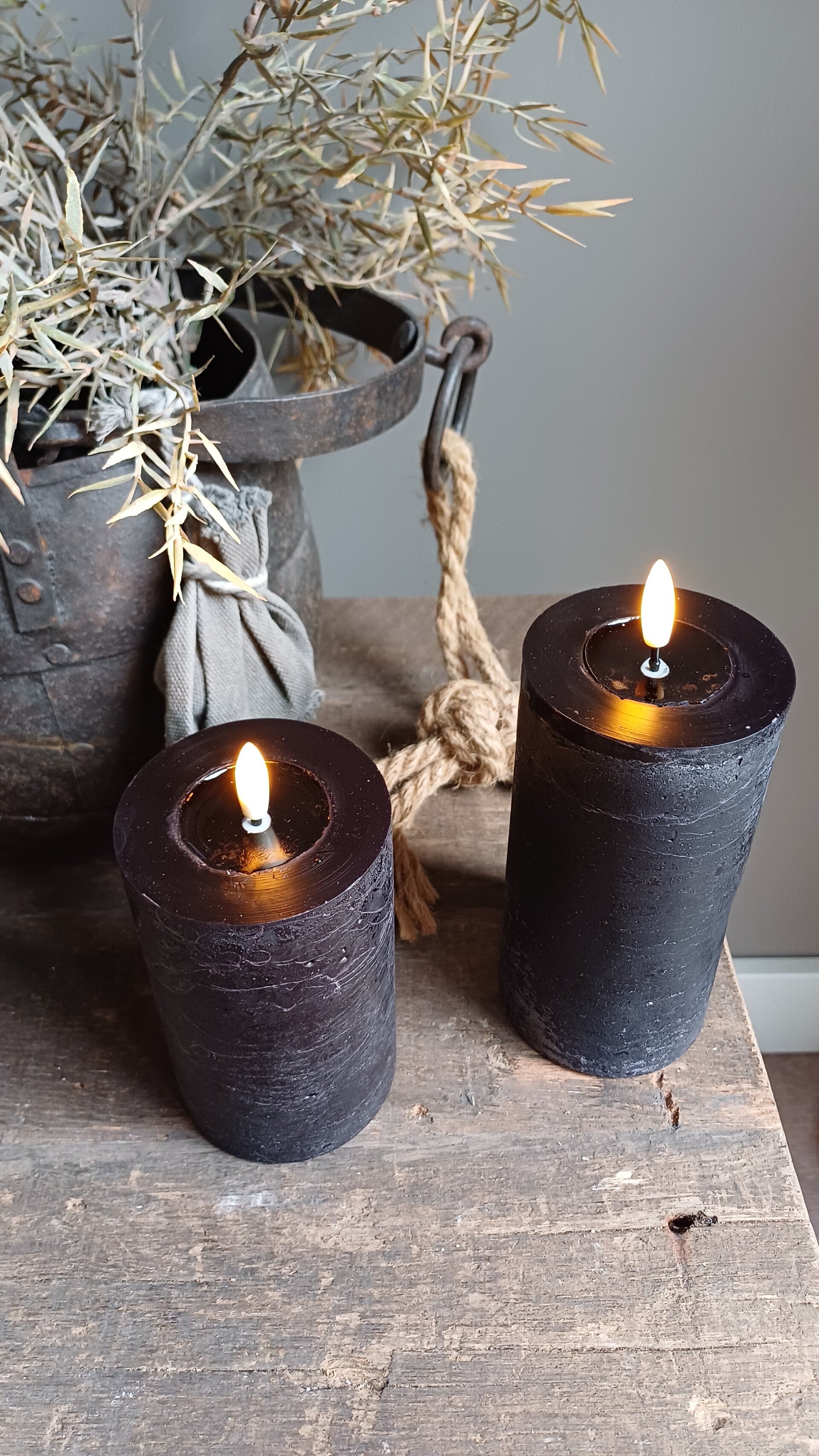 Stompkaars in de kleur zwart wax rustiek. Met 3D lont. De hoogte is 15 cm en de diameter is 7,5 cm. Warm white. Werkend op 2 AA batterijen, niet inbegrepen.