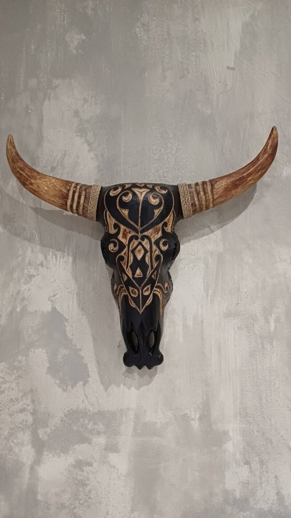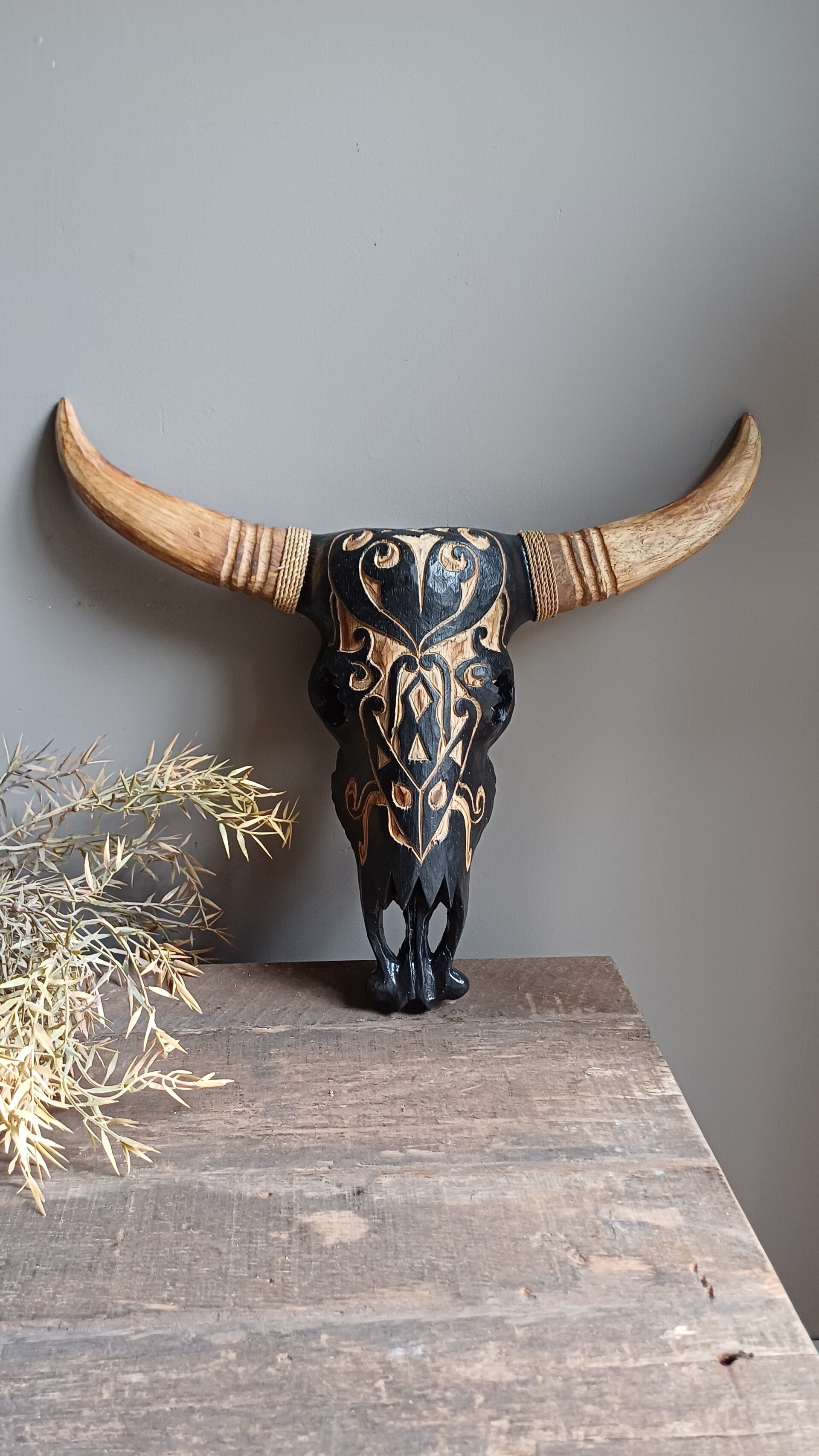 Houten Buffel Schedel, erg mooi met houtsnijwerk. 1 haakje om hem op te hangen.