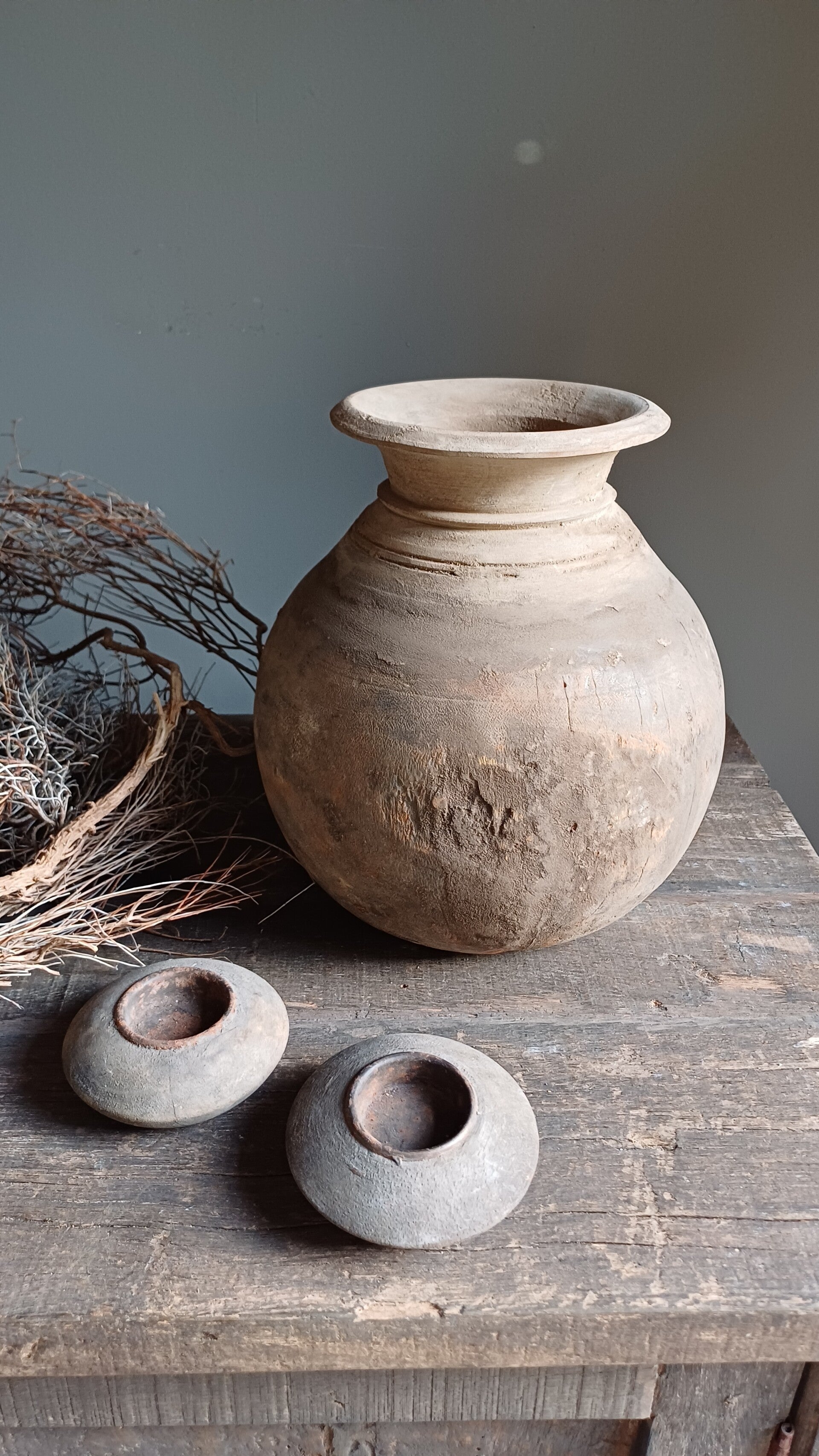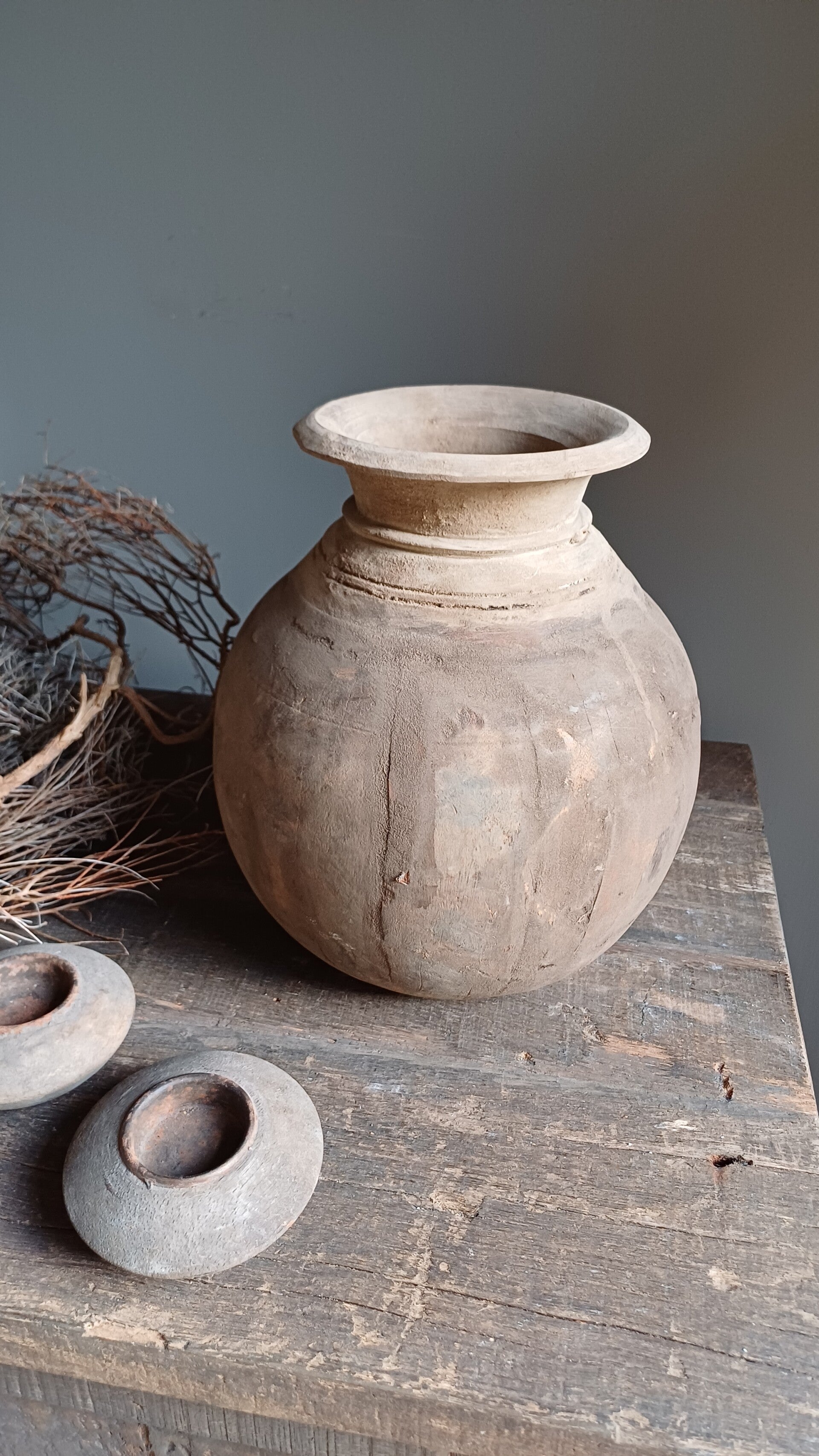 Super gave oude houten pot met een prachtige grijs/bruine kleur. Elke pot heeft zijn eigen karakter, u krijgt de pot op de foto.