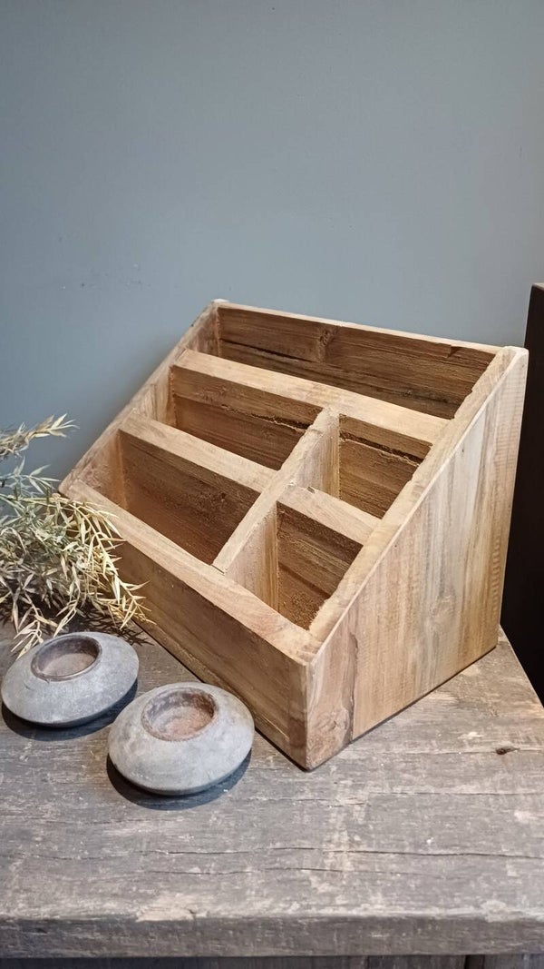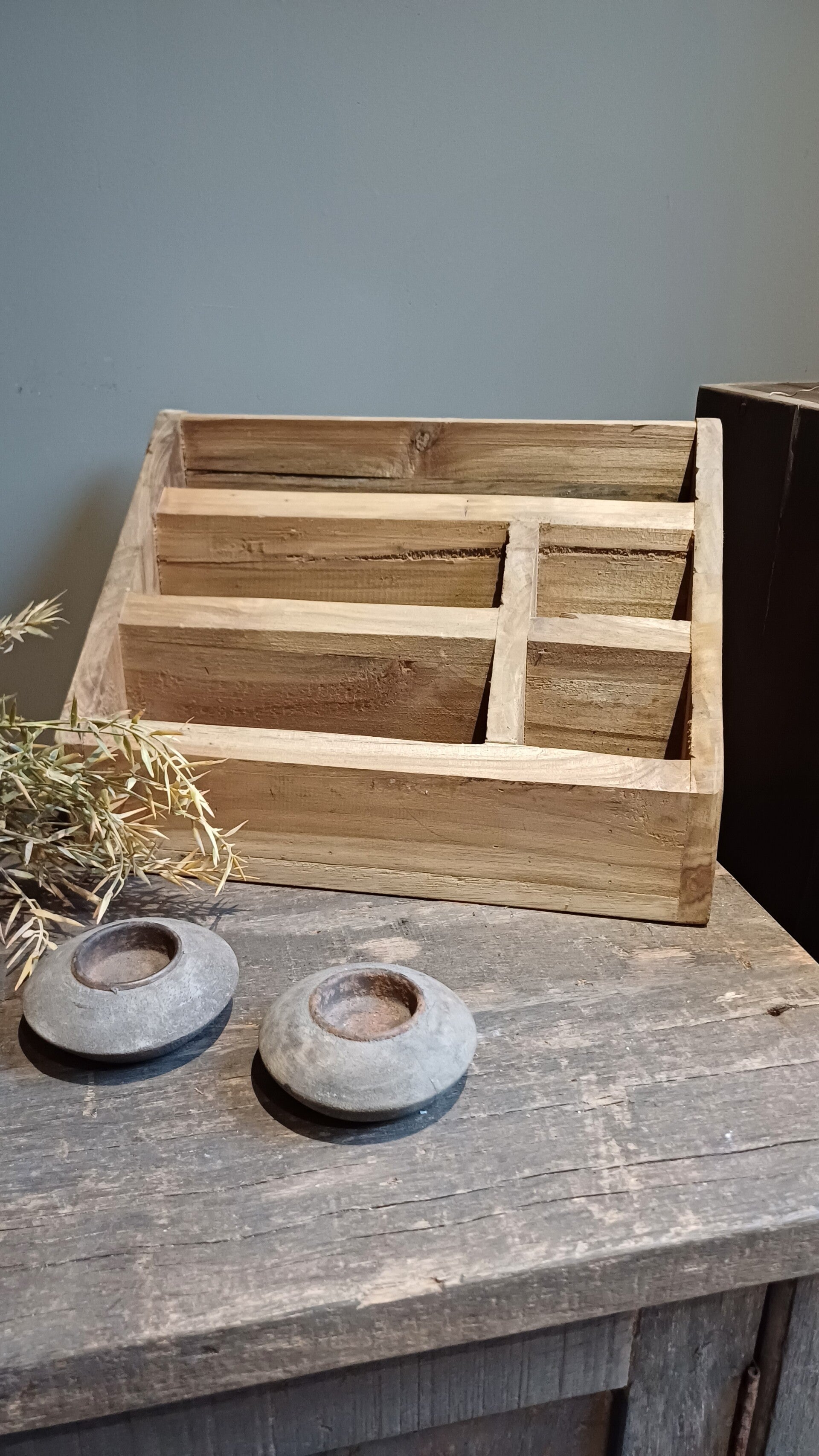 Mooie teakhouten postbak, ook voor schrijfgerei te gebruiken. Maakt het opruimen van losse pennen en blaadjes een stuk gemakkelijker, Daarbij is het een mooie robuuste opberger die niet misstaat in een landelijk interieur.