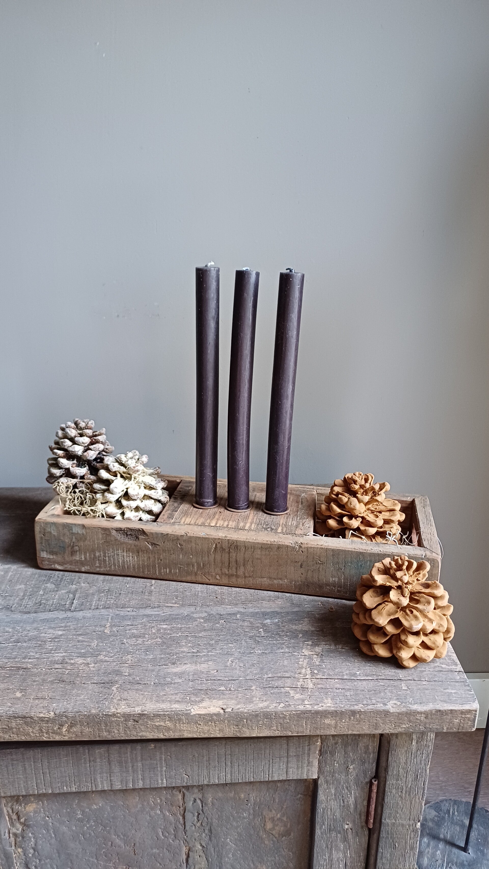 Erg stoer robuust decoratief dienblad voor 3 dinner kaarsen. Je kunt naar eigen invulling er vanalles bij leggen. Elk dienblad is uniek, dus niet 1 is dezelfde, dit maakt hem juist uniek.