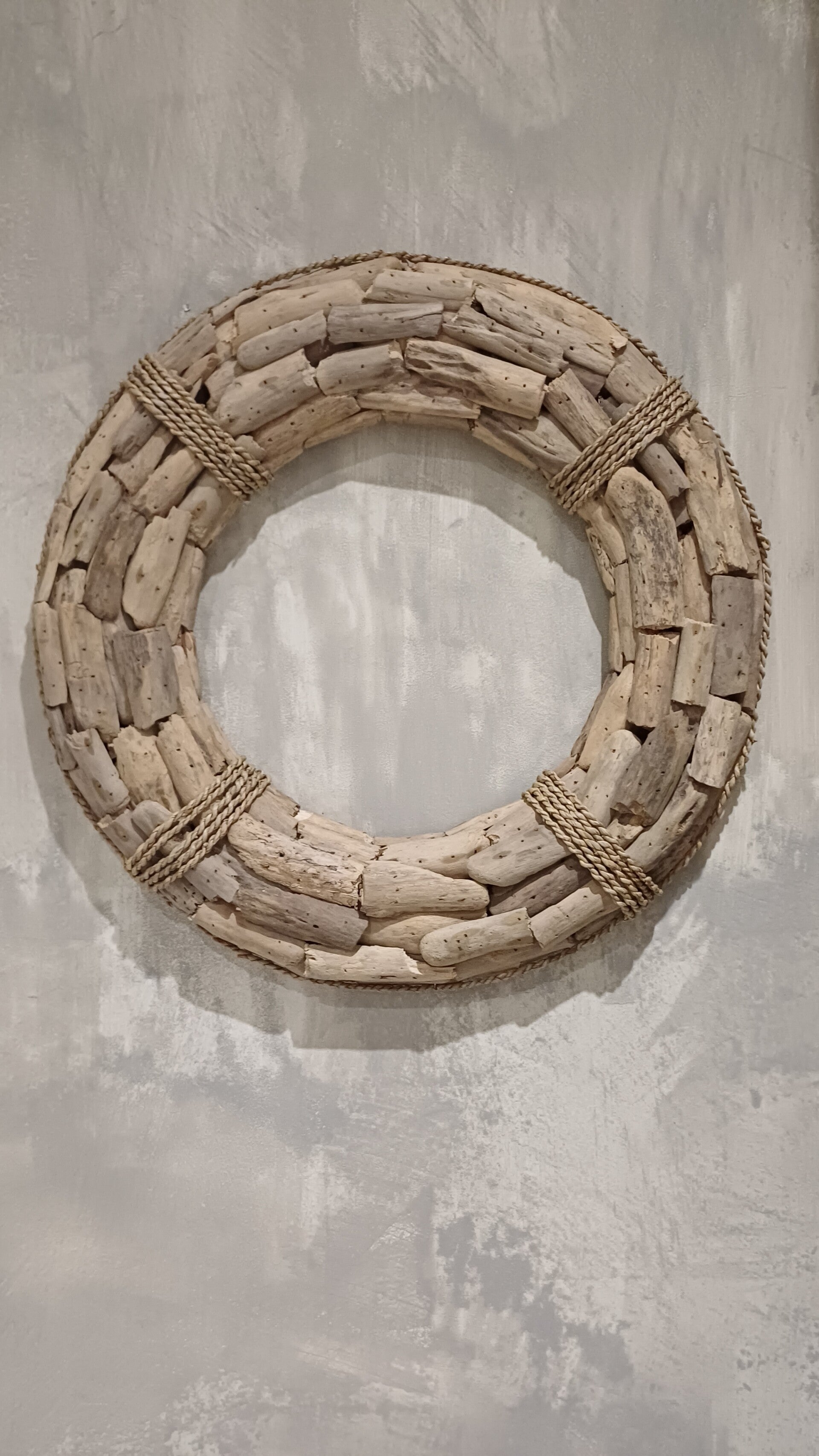Mooie beach-decoratie: een grote krans in de vorm van een reddingsboei gemaakt van driftwood (drijfhout). Voor binnen, of voor buiten aan de muur. U krijgt de krans zoals op foto.