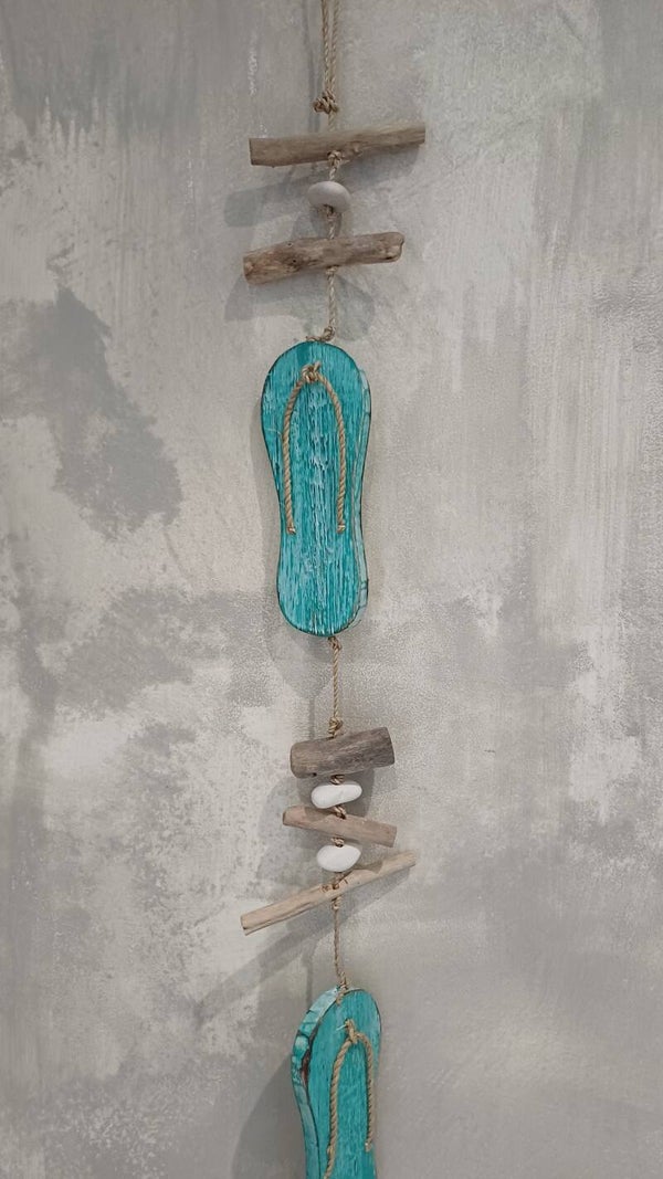 Erg leuke guirlande/mobiel met drijfhout stokjes en slippertjes voor een beach gevoel te crieëren. Door de opvallende frisse kleur valt hij echt op.