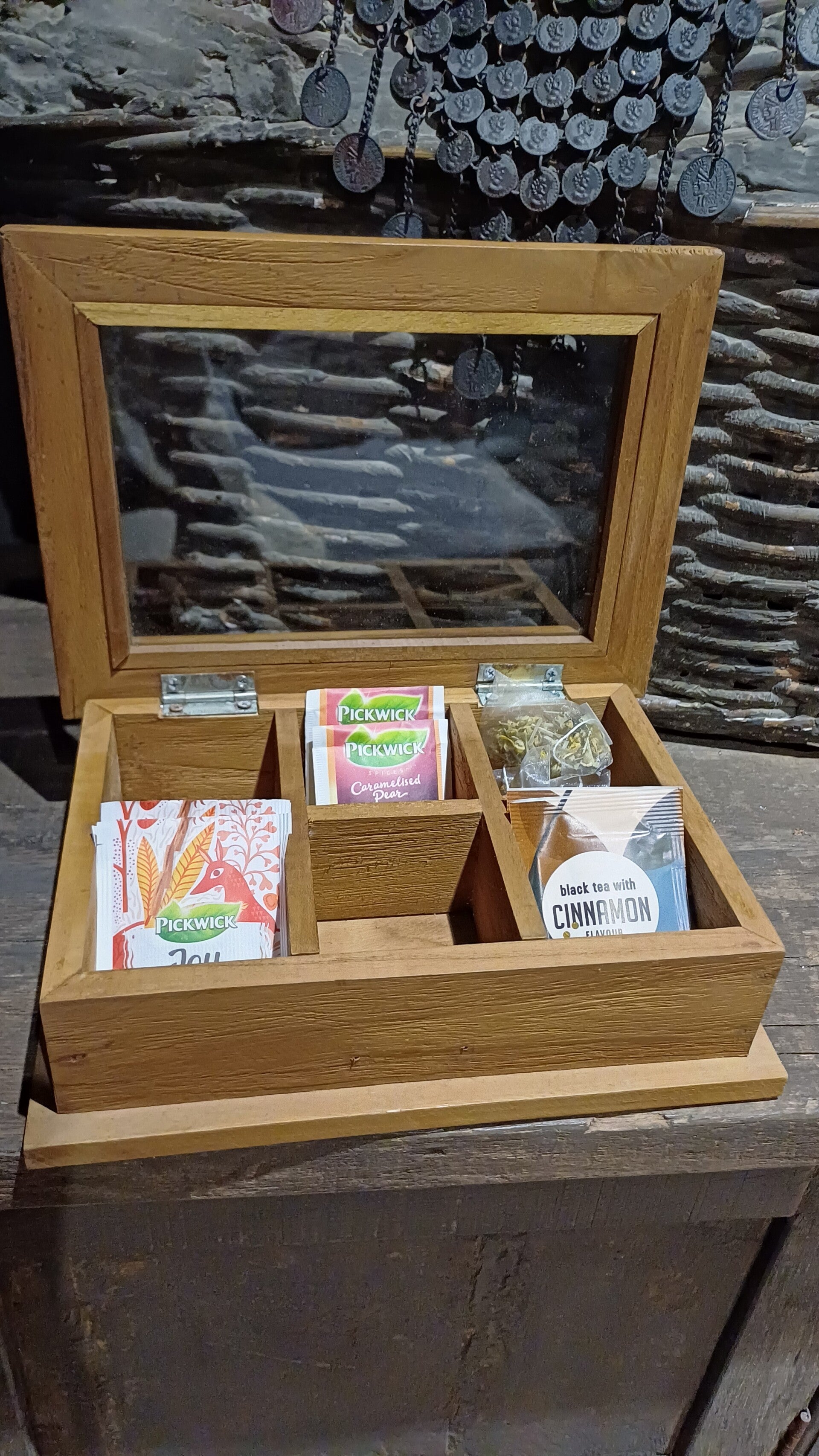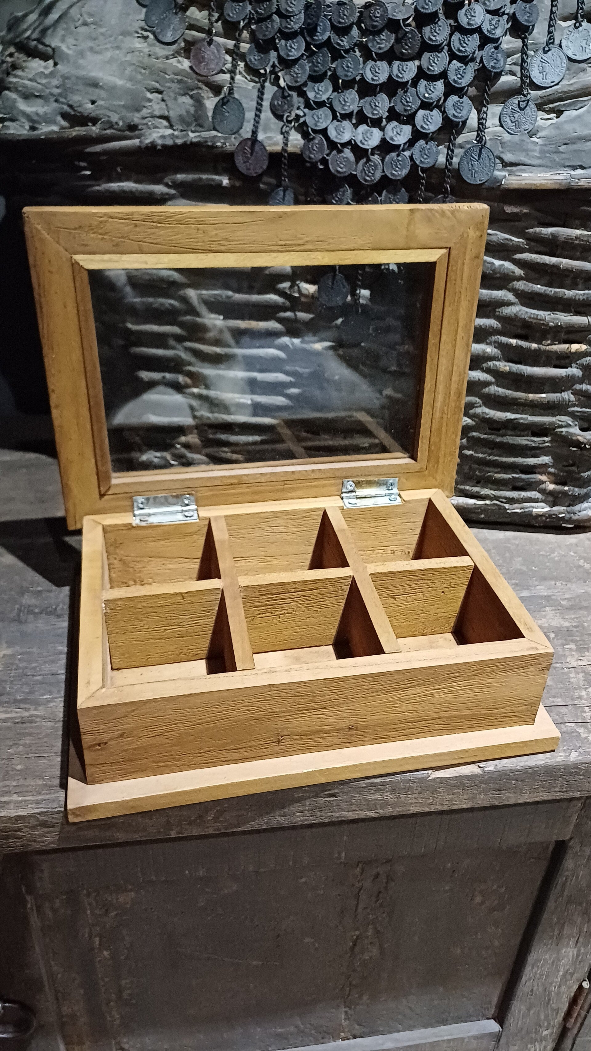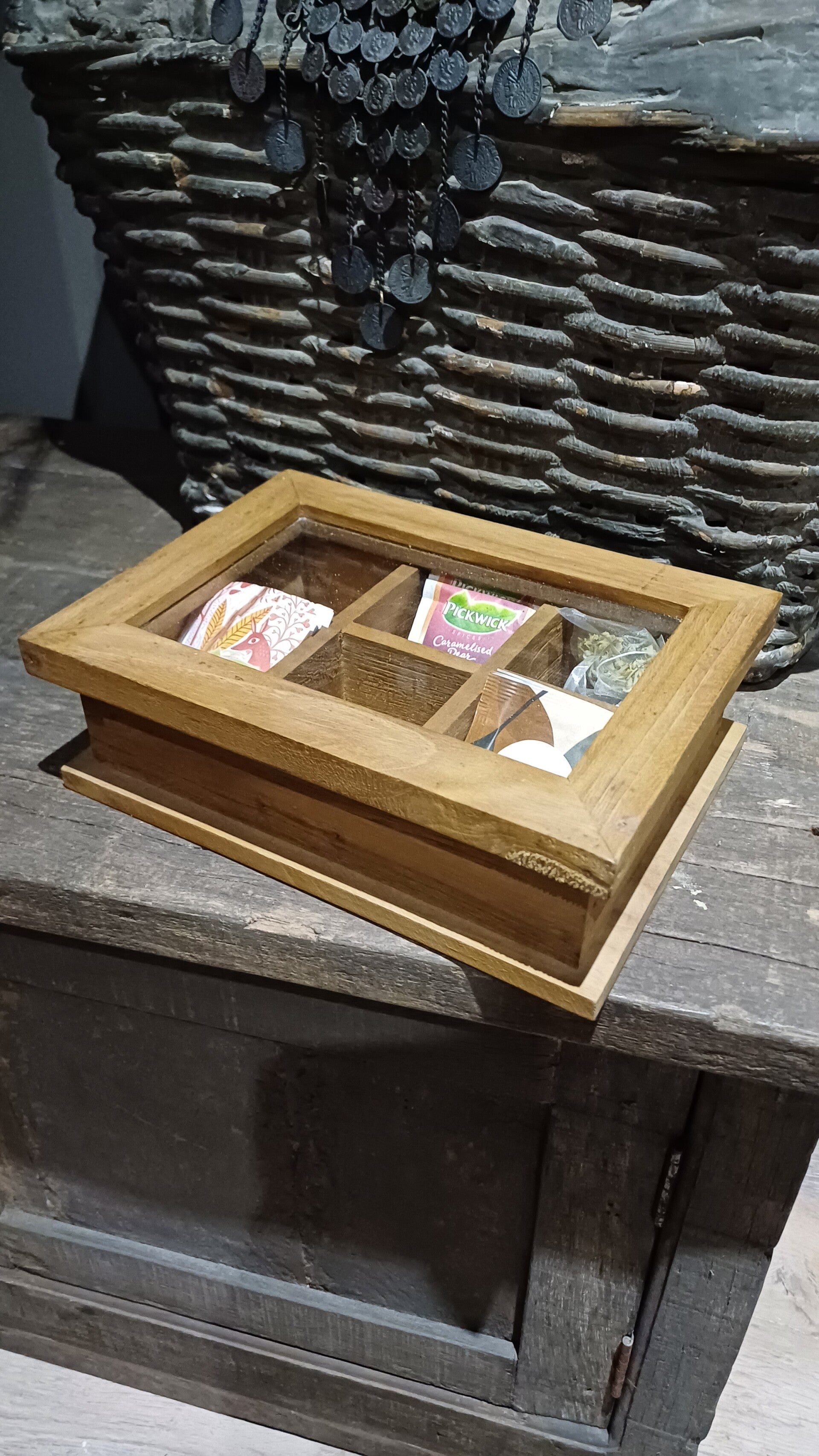 Deze 6 vaks is ideaal voor het opbergen van al je favoriete theesmaken. Houten landelijke doos die mooi op elk aanrecht past. Deksel met scharnieren, door het glas zie je meteen wat er nog inzit.