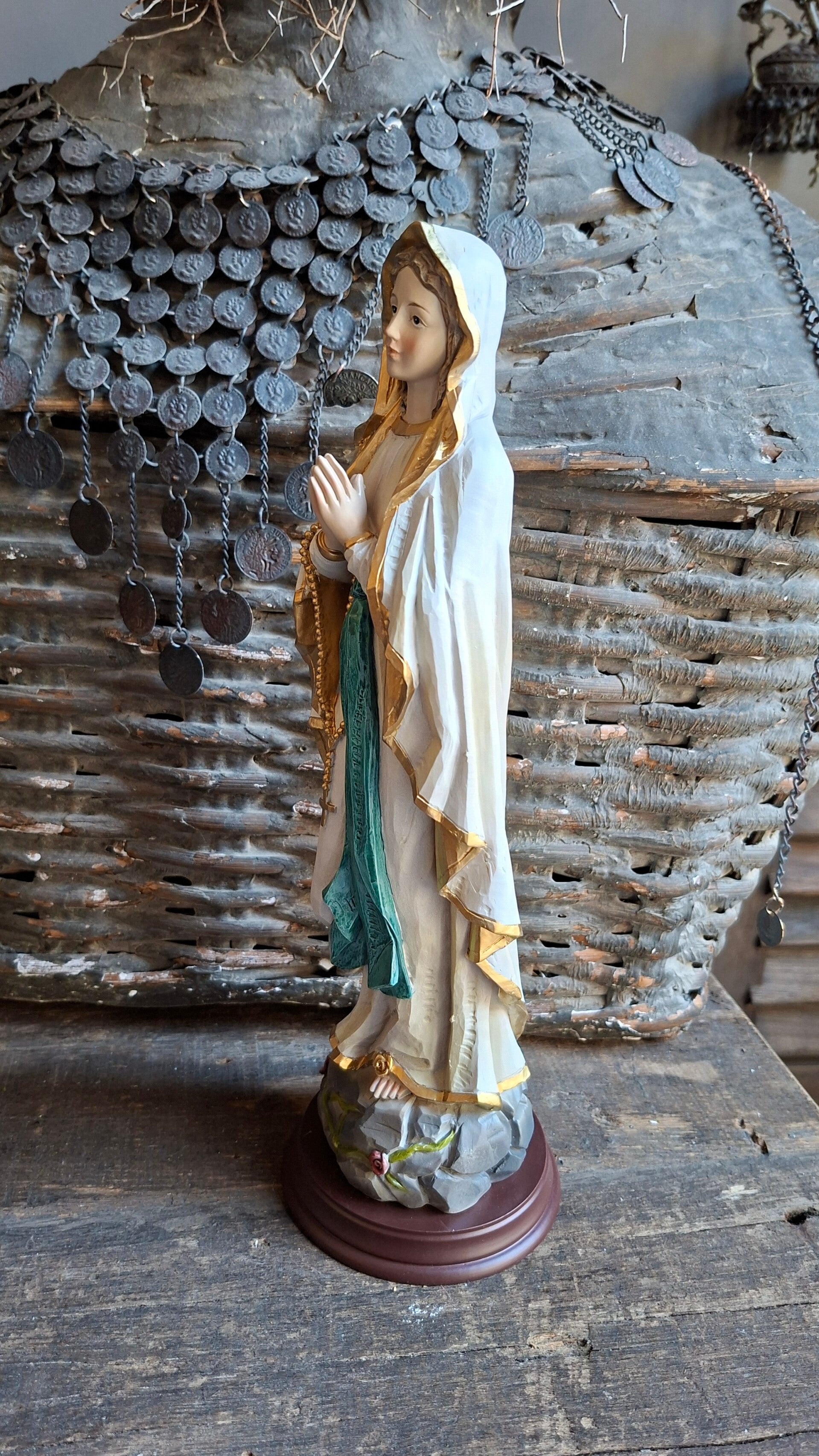 Dit prachtige Maria beeldje van polystone straalt rust, liefde en spiritualiteit uit.