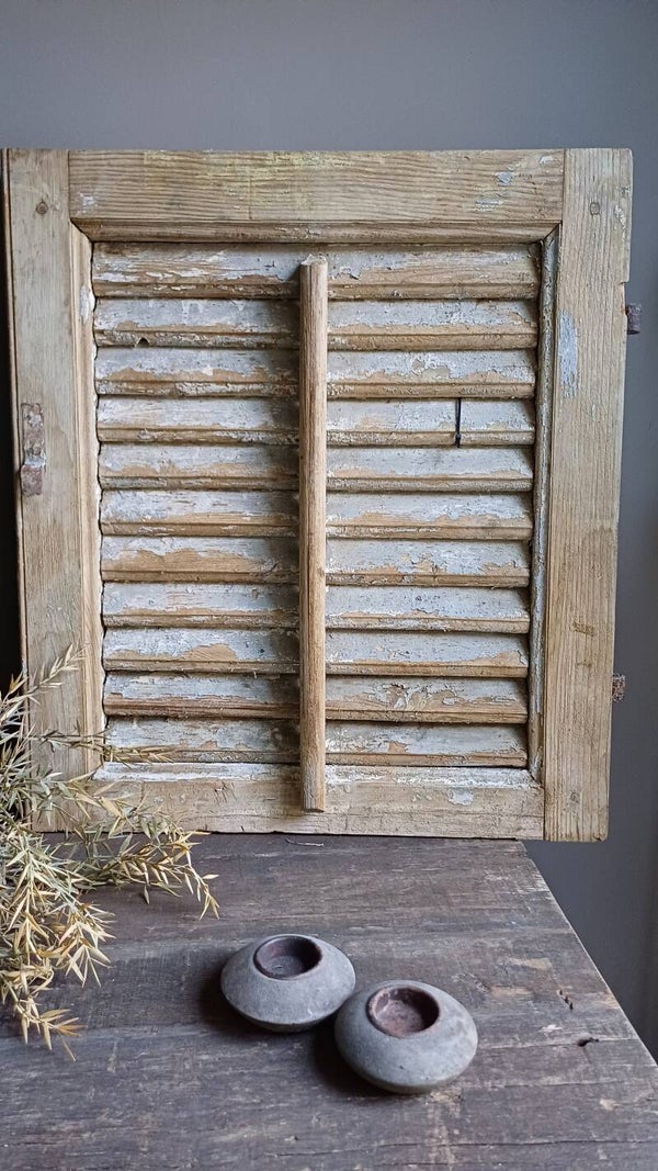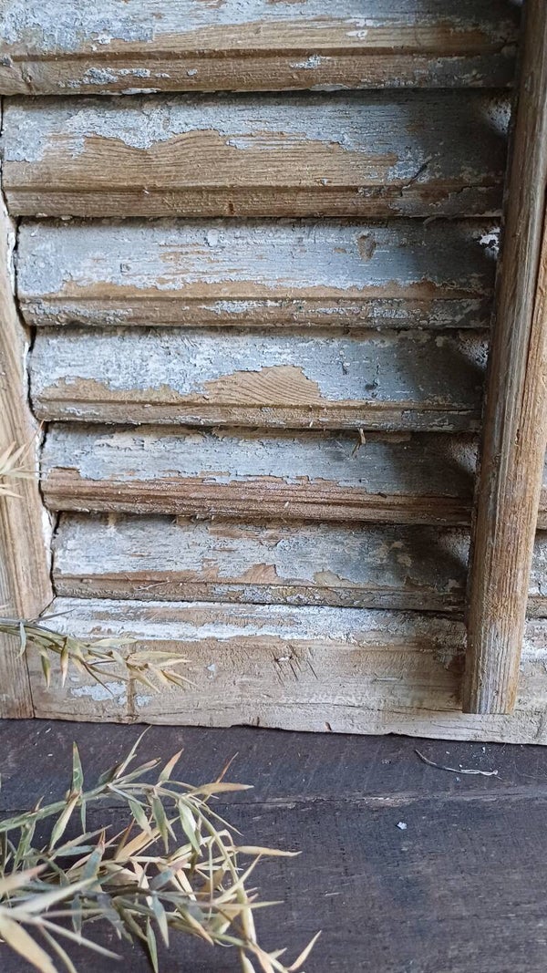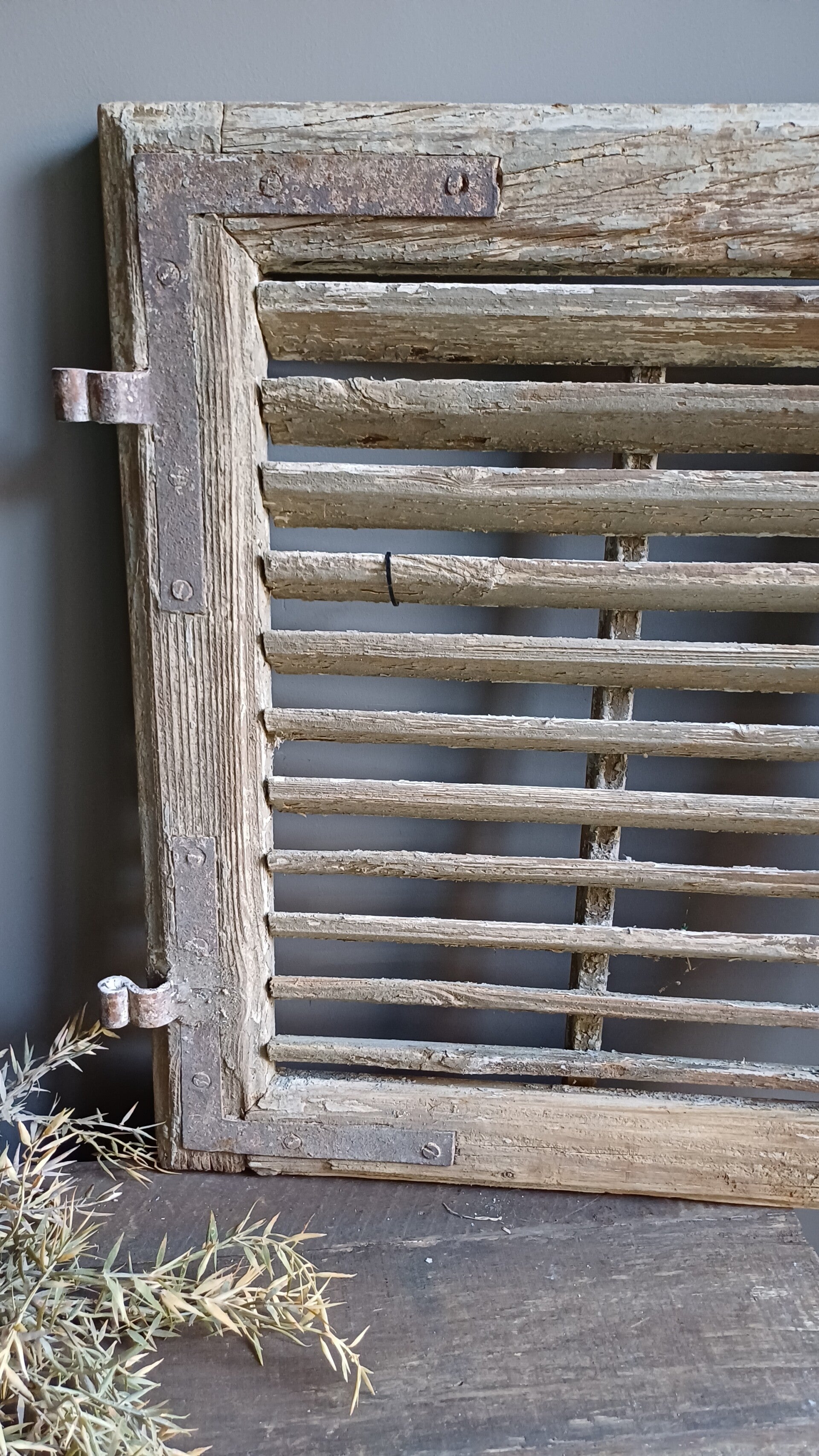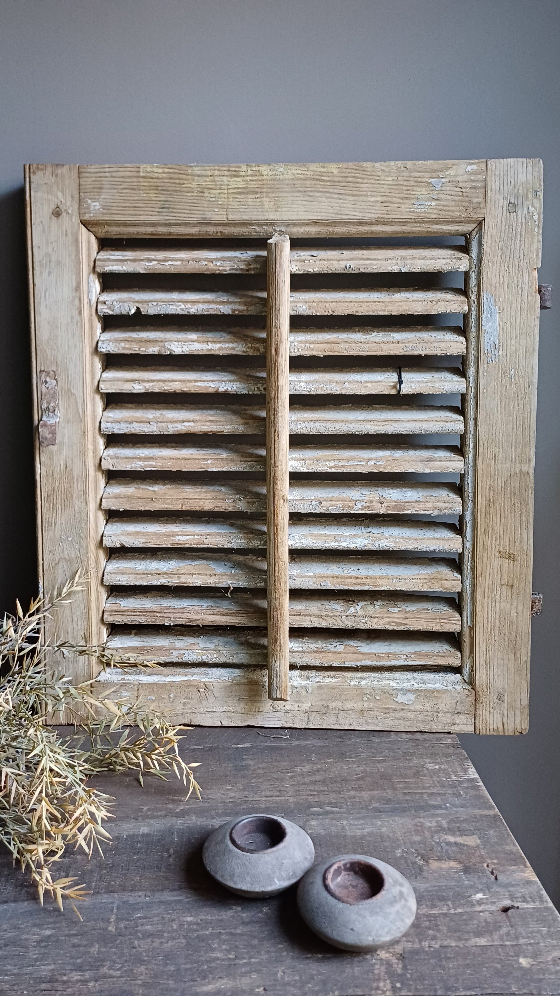 Prachtig oud doorleefd Frans louvre luik. De lamellen zijn te openen door het latje aan de voorkant omhoog/omlaag te schuiven.