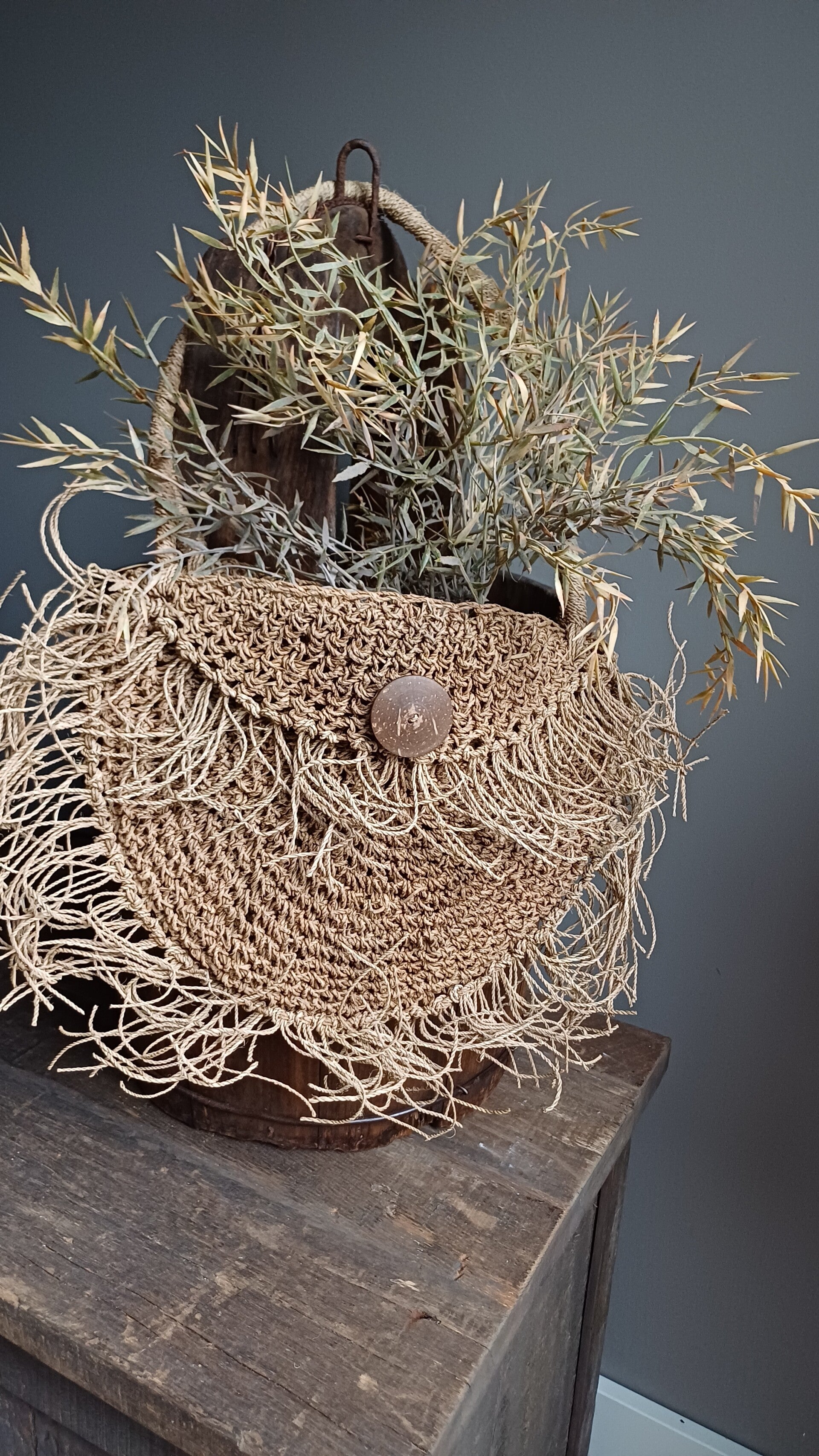 Super leuk tasje gevlochten van hard zeegras, erg leuk om mee te decoreren. Hang hem aan een ladder of aan een deurknop, shabby doeje of kunst tak erin en hij past perfect in een landelijk/sobere stijl.