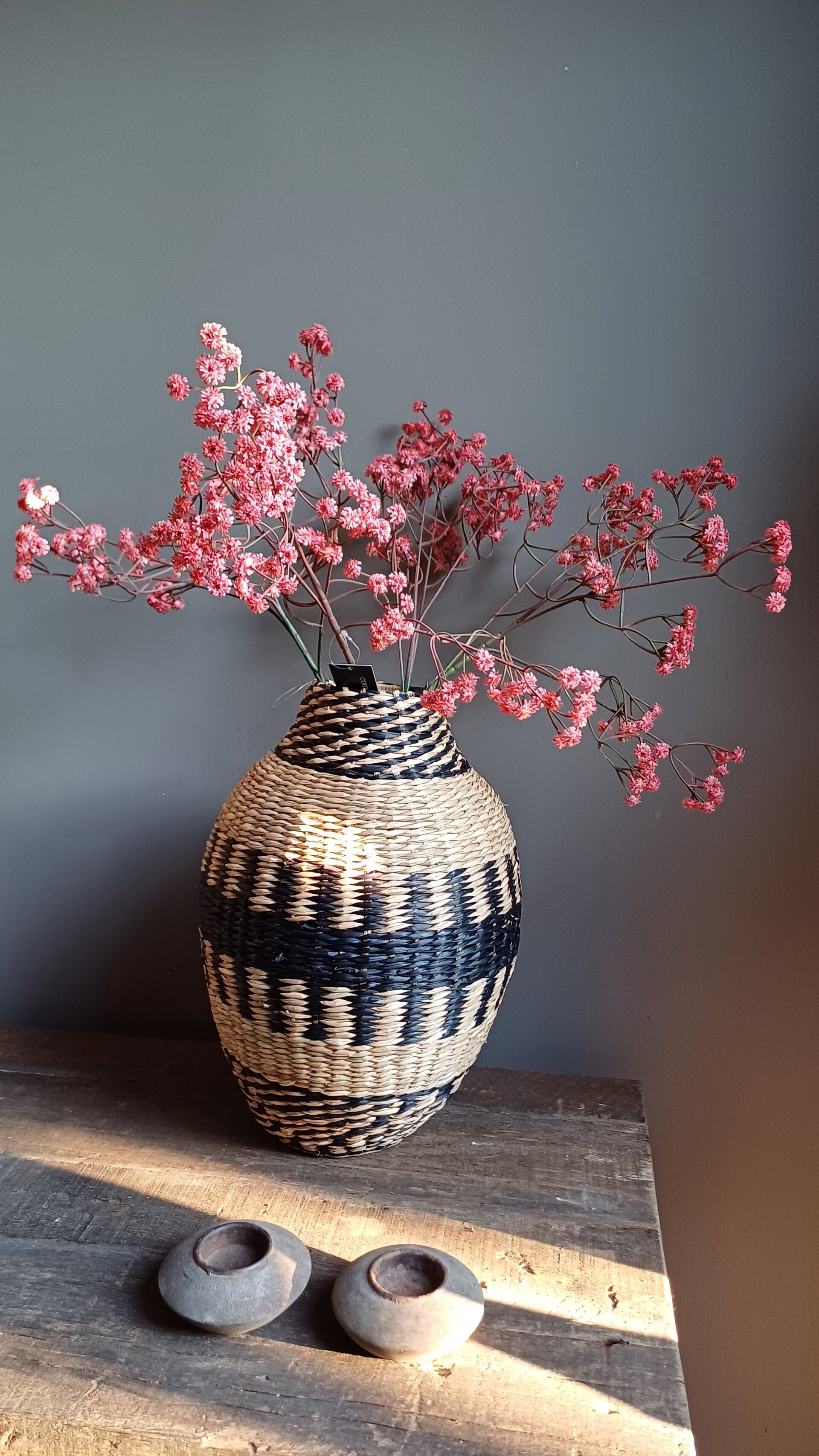 De vaas heeft een bohemian uitstraling dankzij het rotan. De vaas heeft een smalle bovenkant en een zwarte print. Plaats hem op de eettafel of als eyecatcher in de vensterbank met een mooie kunsttak.