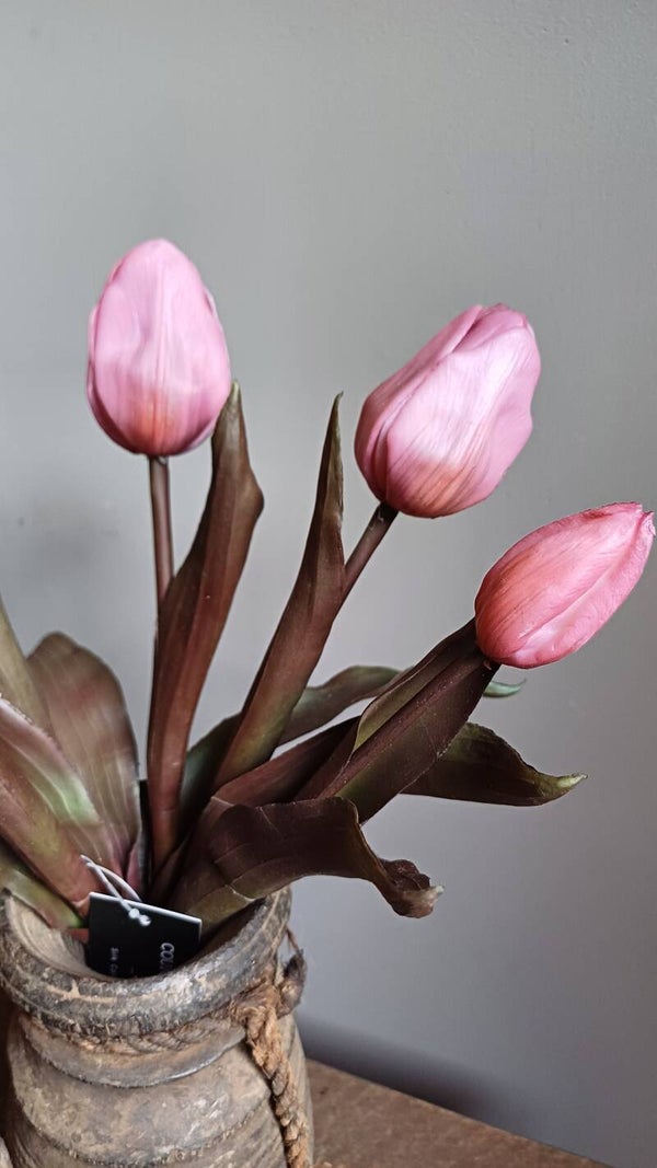 Deze kunst tulpen zijn niet van echt te onderscheiden in gewicht- en gevoel niet. Hoe mooi tulpen ook zijn ze zijn meestal binnen een week uitgebloeid. Dit is de ultime oplossing. Leuke tak (kunst) erbij en klaar.
