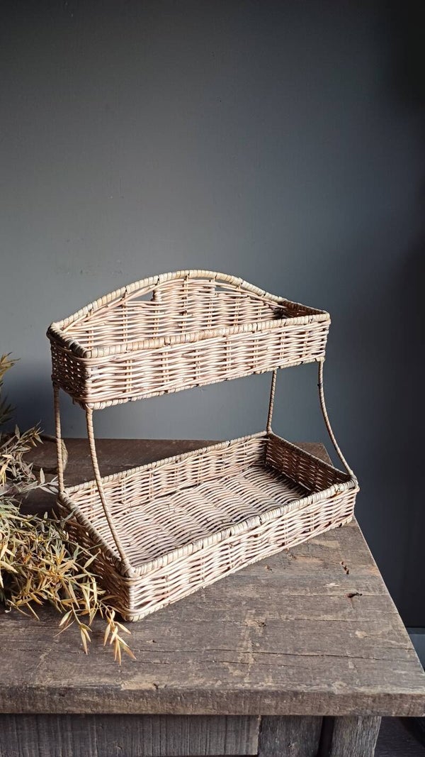 Stevig rieten rekje ( dubbelhoog) met ijzeren frame. Geschikt als kruidenrekje. Ook mistaat het rekje niet in de badkamer. Het rekje kun je ophangen en ook gewoon neerzetten.