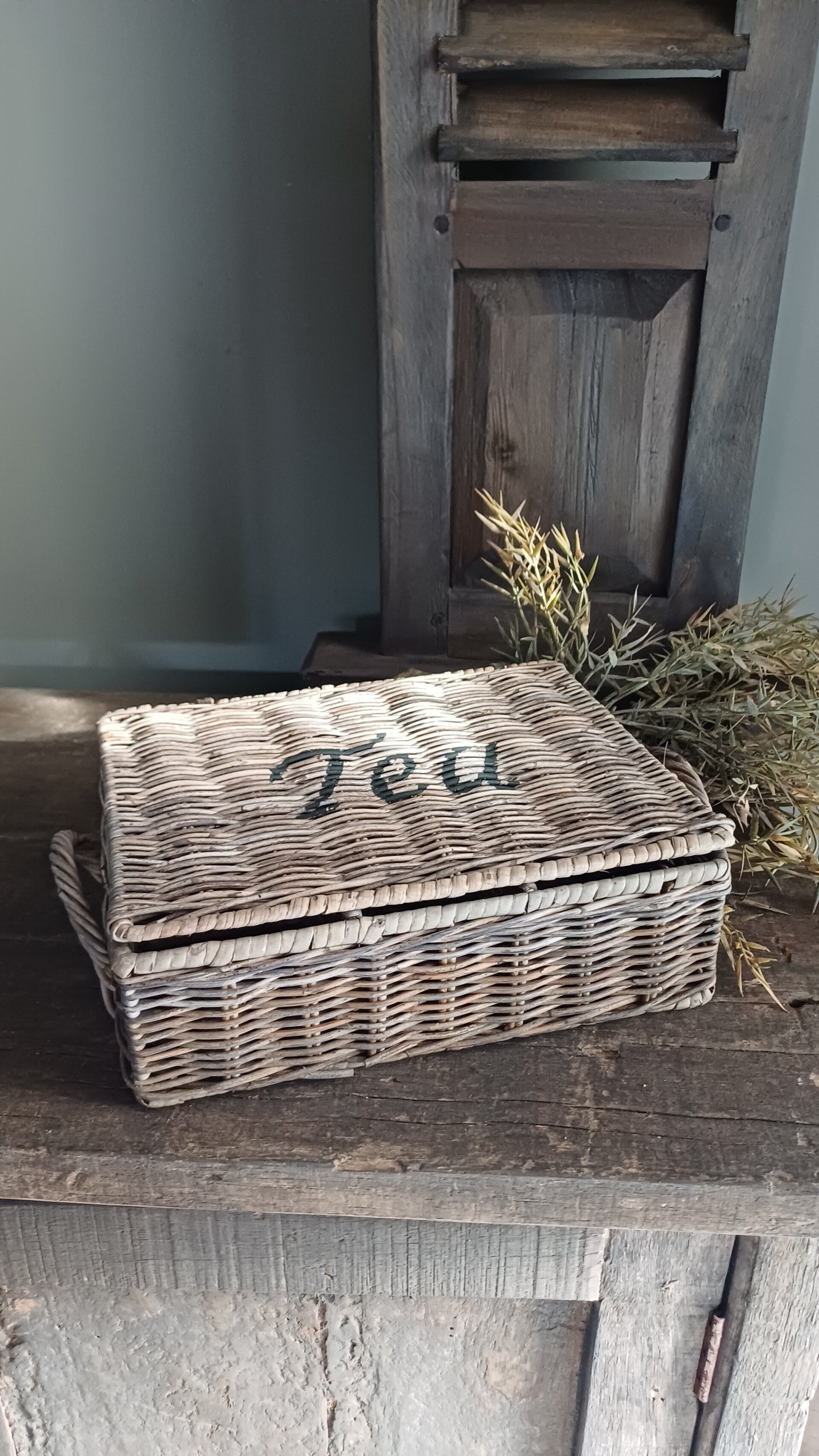 Rieten theedoos met 6 vakjes . Orginele uitvoering in een landelijke look. Gevlochten met metalen frame.