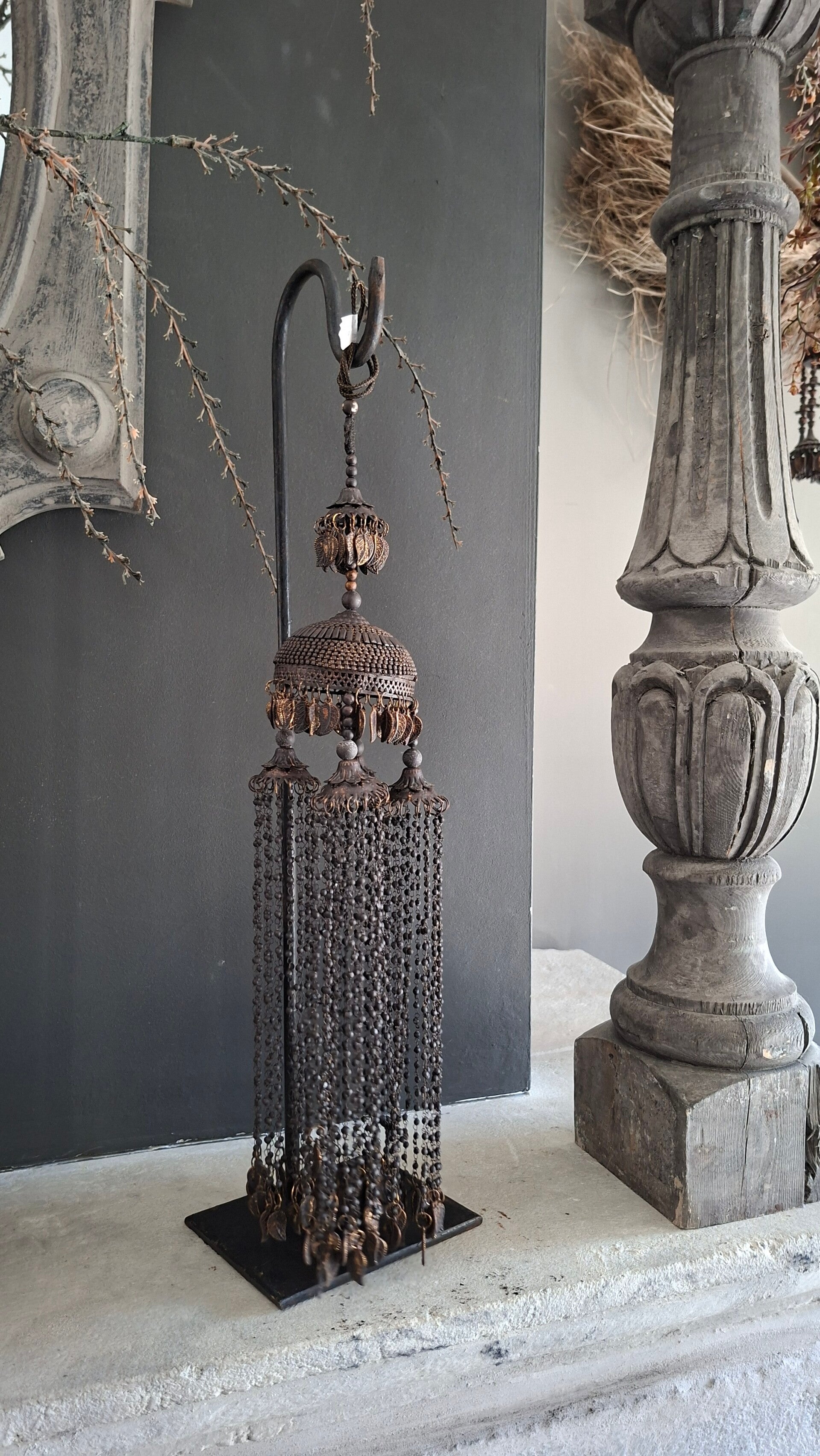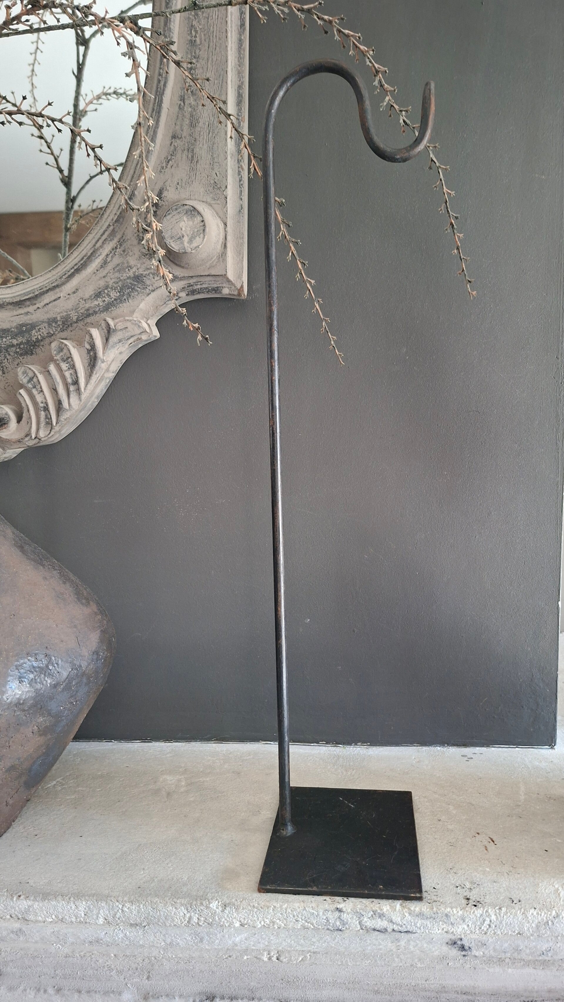 Handige metalen statief om iets aan te hangen, bv LouLou hanger of een krans. Maat: 51cm hoog/12,5x10cm plaat