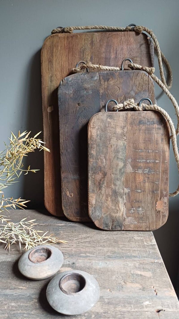 Erg stoer robuuste broodplank met stoer touw om hem op te kunnen hangen. Elk product is anders en heeft zijn eigen karakter.