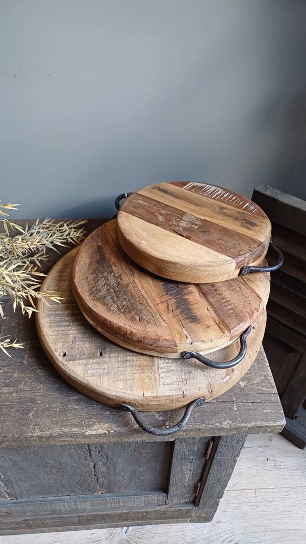 Stoere ronde serveerplanken /broodplanken gemaakt van gerecycled hout, set van 3 planken met metalen greepjes aan beide kanten. Zeer decoratief en handig.