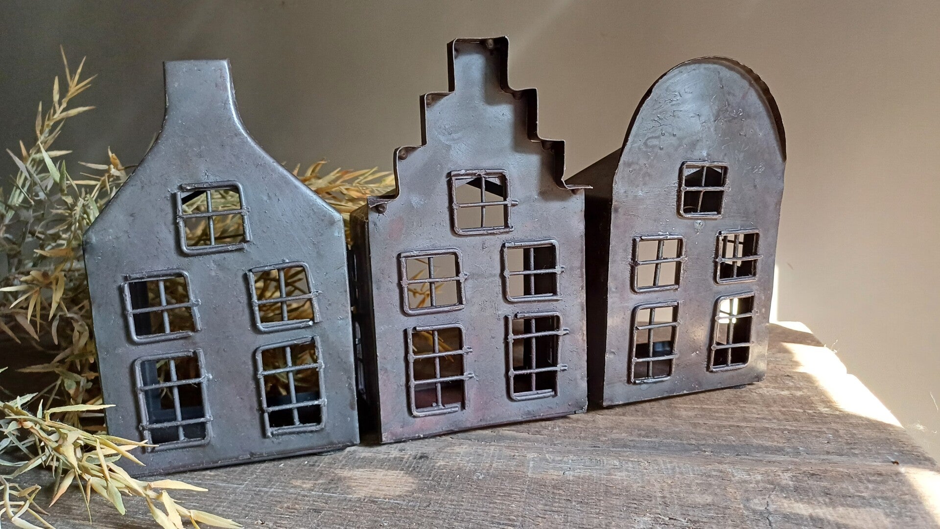 Metalen set van 3 grachtenhuisjes, je kunt er een theelichtje indoen zodat die savonds extra sfeer geeft.