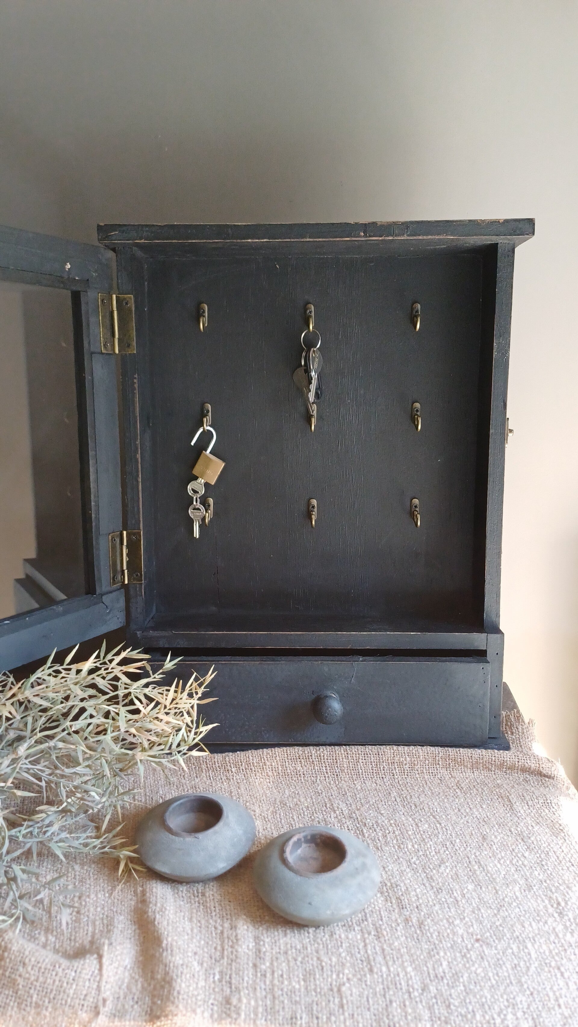Wij herkennen het probleem als geen ander! Maar dan biedt dit landelijk sleutelkastje de perfecte oplossing. Dit sleutelkastje biedt genoeg ruimte voor een heel gezin. Hang je sleutels georganiseerd op en je hebt ook nog eens leuk kastje om naar te kijken. Er is plaats voor 9 sleutels en haakjes aan de achterkant voor op te hangen.