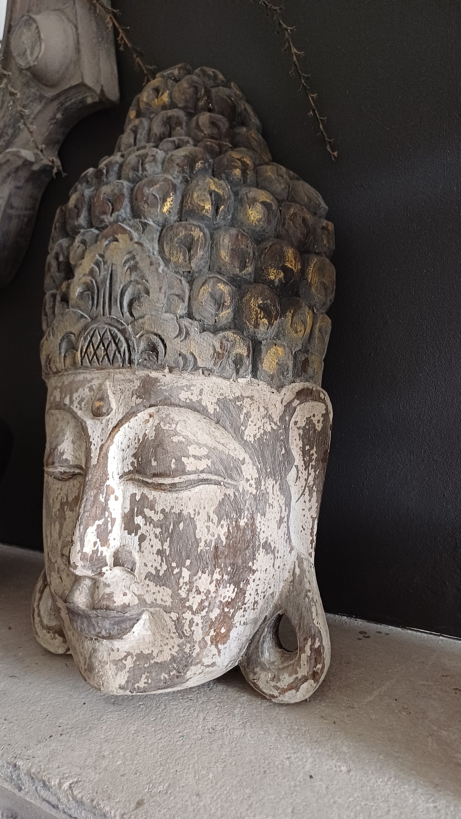 Mooi boeddha hoofd in een prachtige kleur, het hoofd gedeelte heeft minimaal goud nuance. Achterkant zit een haak om hem op te hangen.