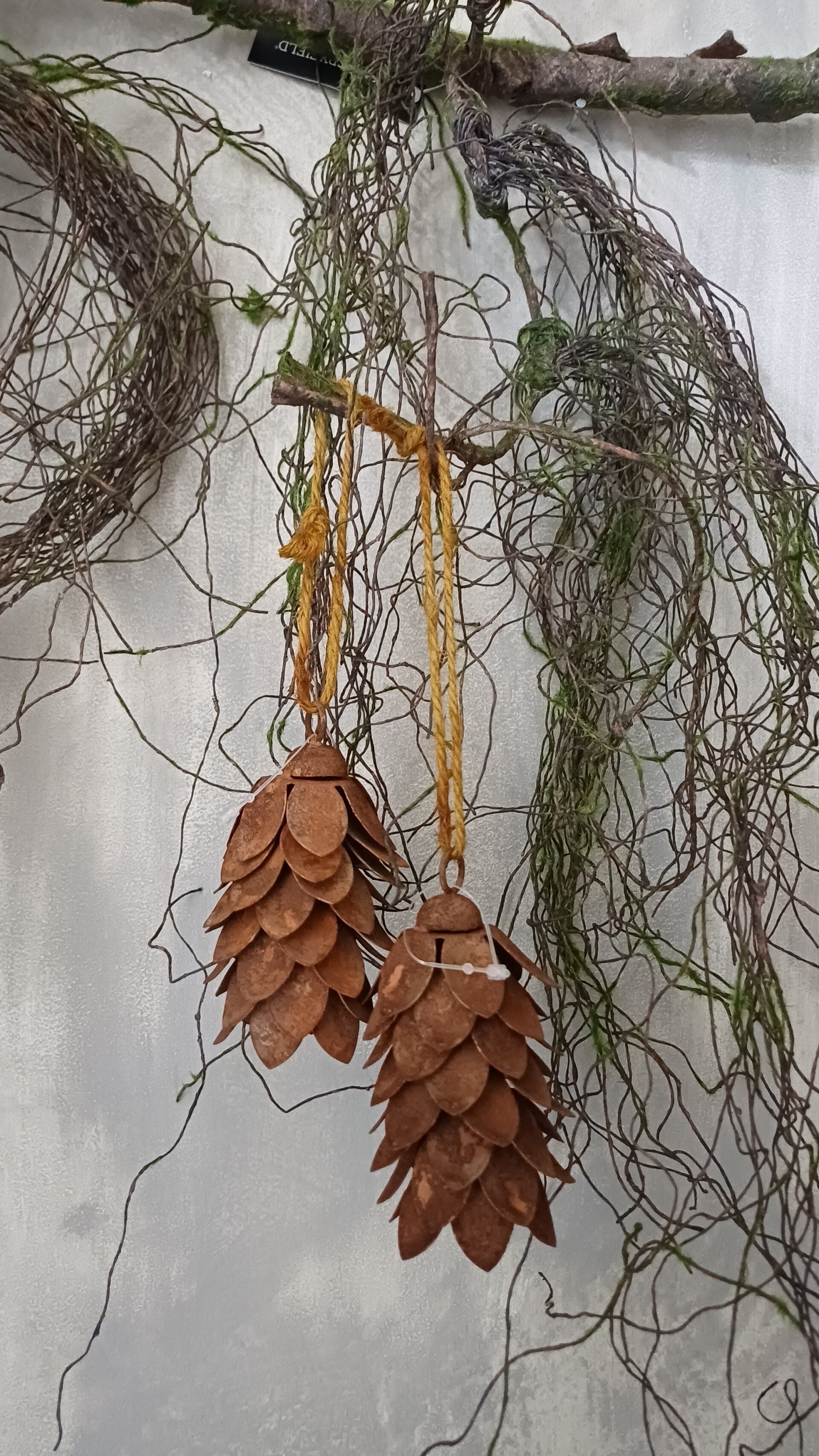 Metalen dennenappel in roestafwerking met ophanglus.Perfect voor landelijke kransen, takken of kerstdecoratie.