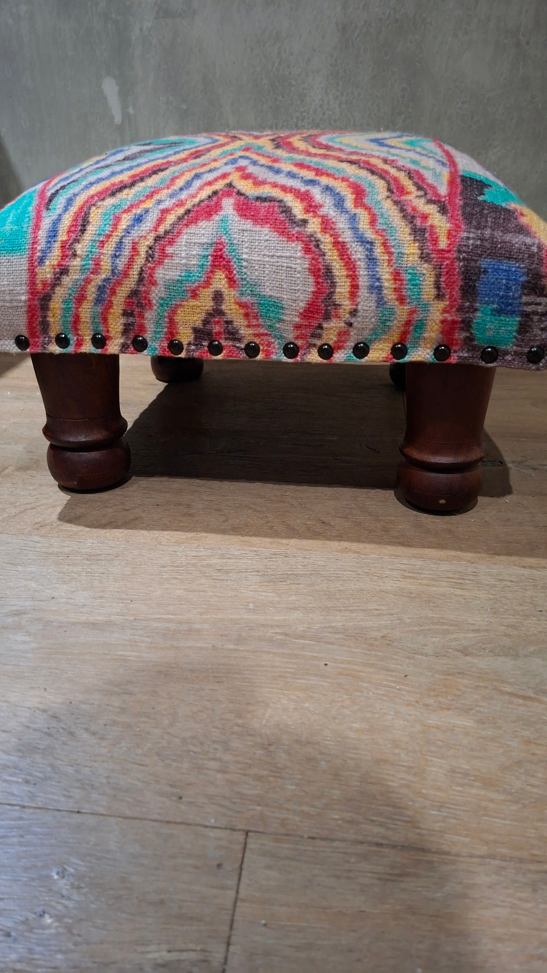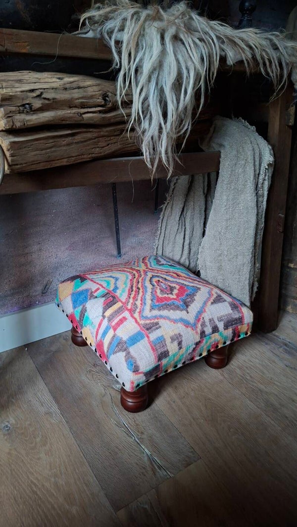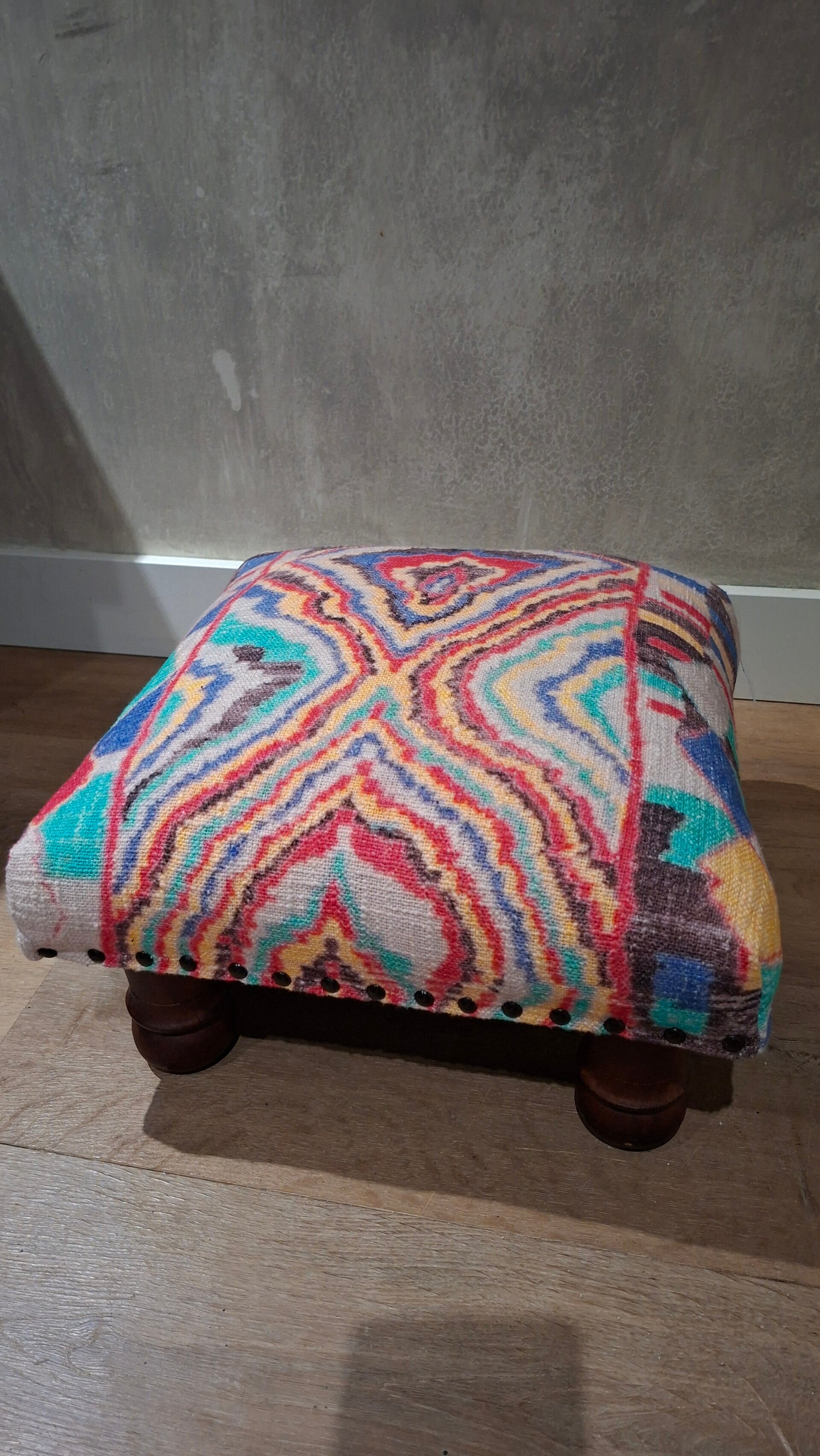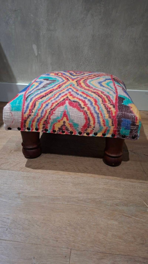 Mooi bekleed met frisse stof Zie voor de kleurstelling de foto. Deze poef is geschikt als voeten bankje en past in diverse interieurs.