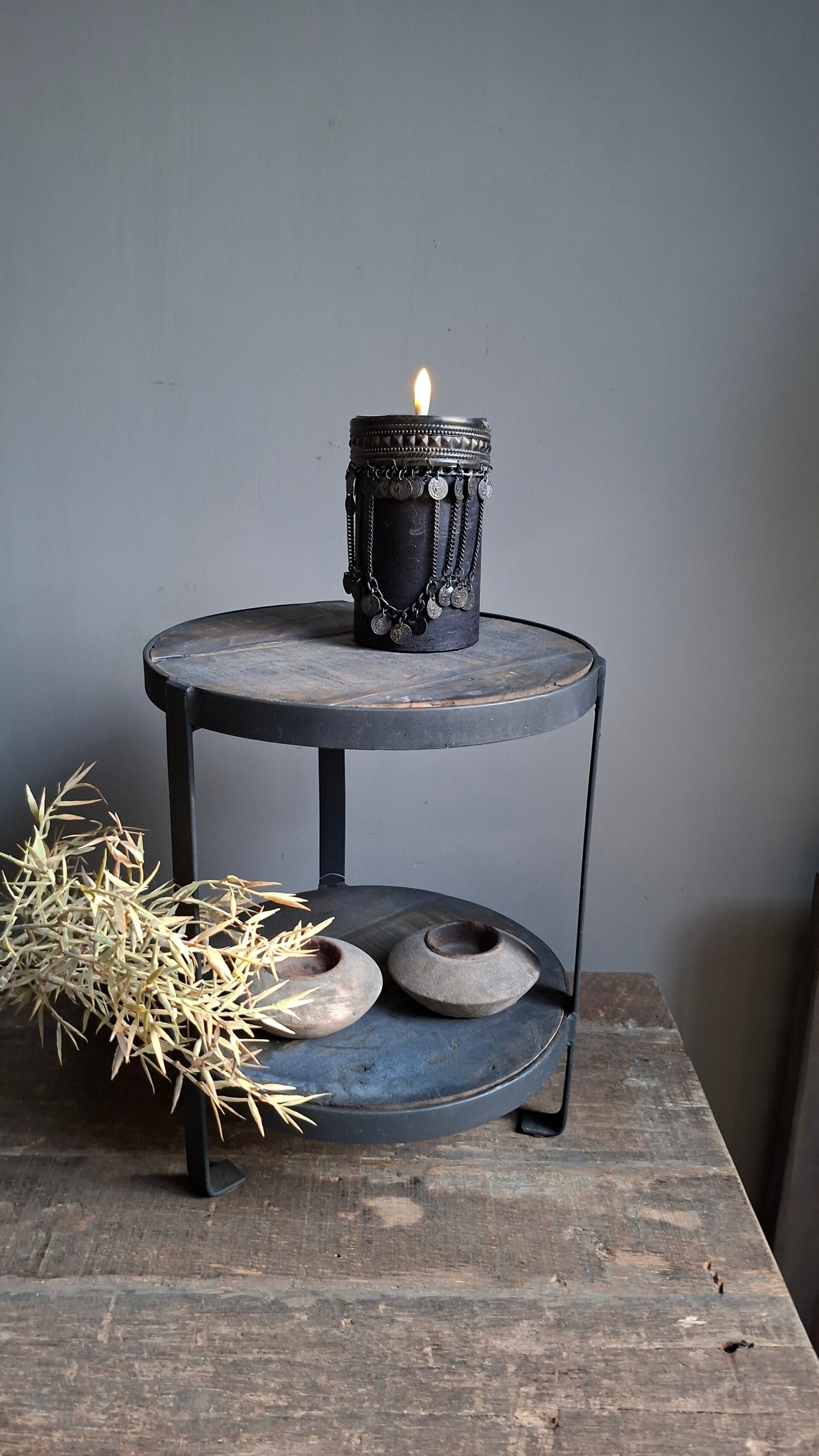 Presentatie etagere is gemaakt van een zwart gepoedercoate metalen voetsteun voorzien van 3 etages. De rustieke plankjes zijn gemaakt van oud hout in een donkere kleur. Een geweldige presentatie eyecatcher! Let op: niet in de vaatwasser plaatsen. Om eventueel te reinigen enkel met een vochtige doek afnemen.