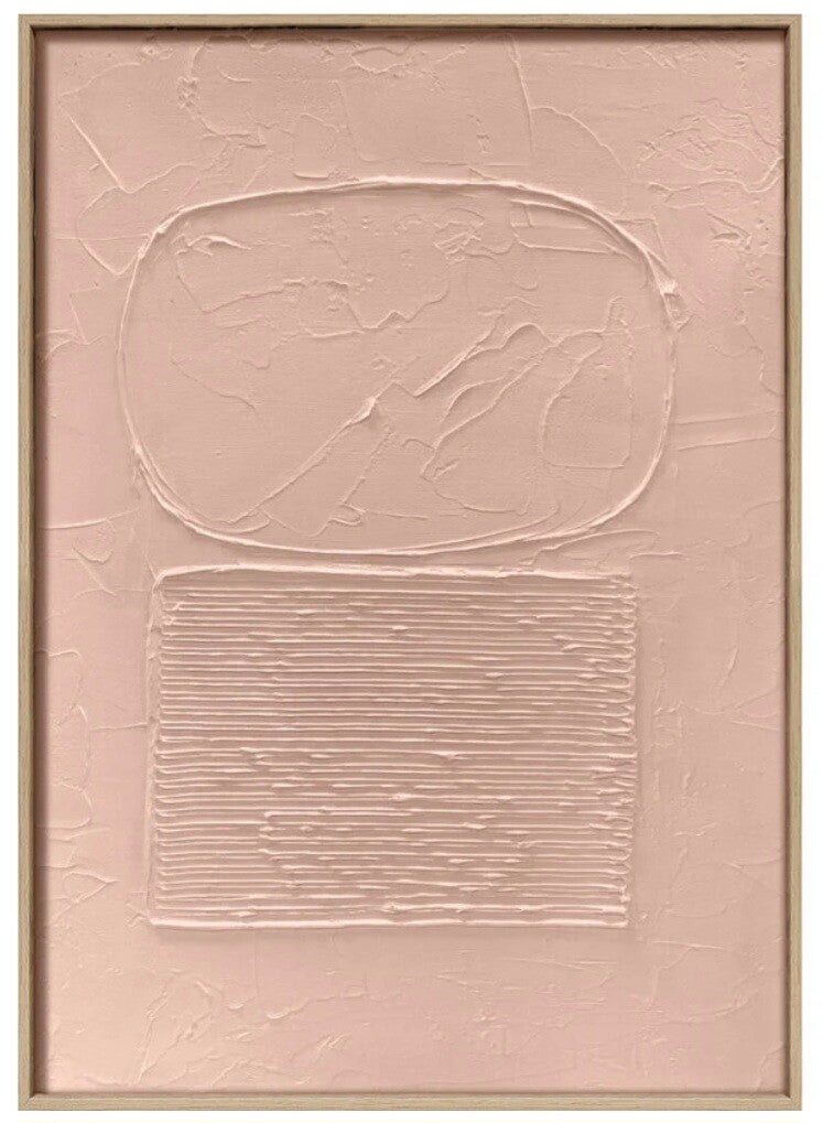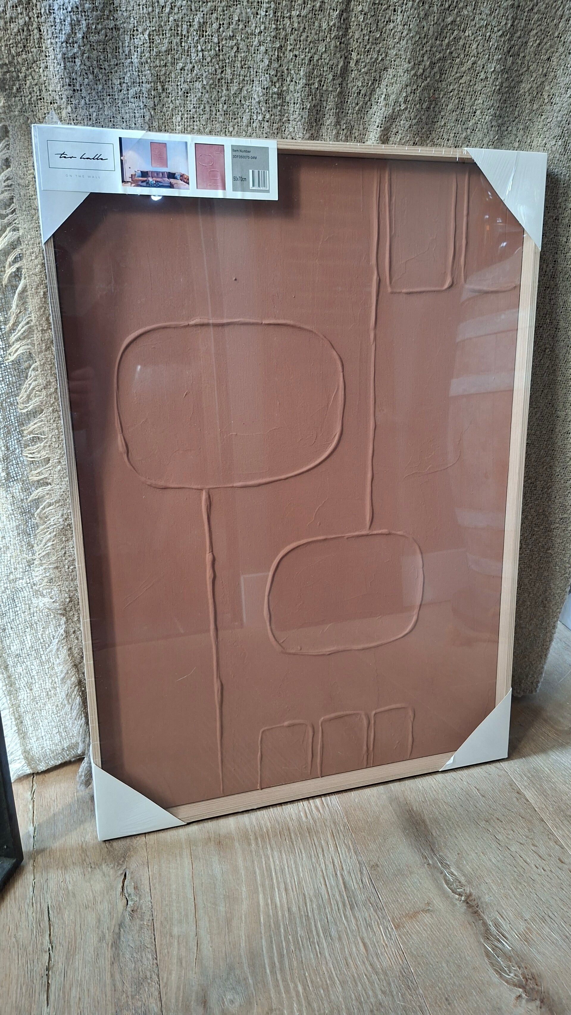 3D wanddecoratie terracotta kleur. Er zit een licht houten lijst omheen zoals op foto 2. De foto waar schilderij is ingepakt is het schilderij die je krijgt.