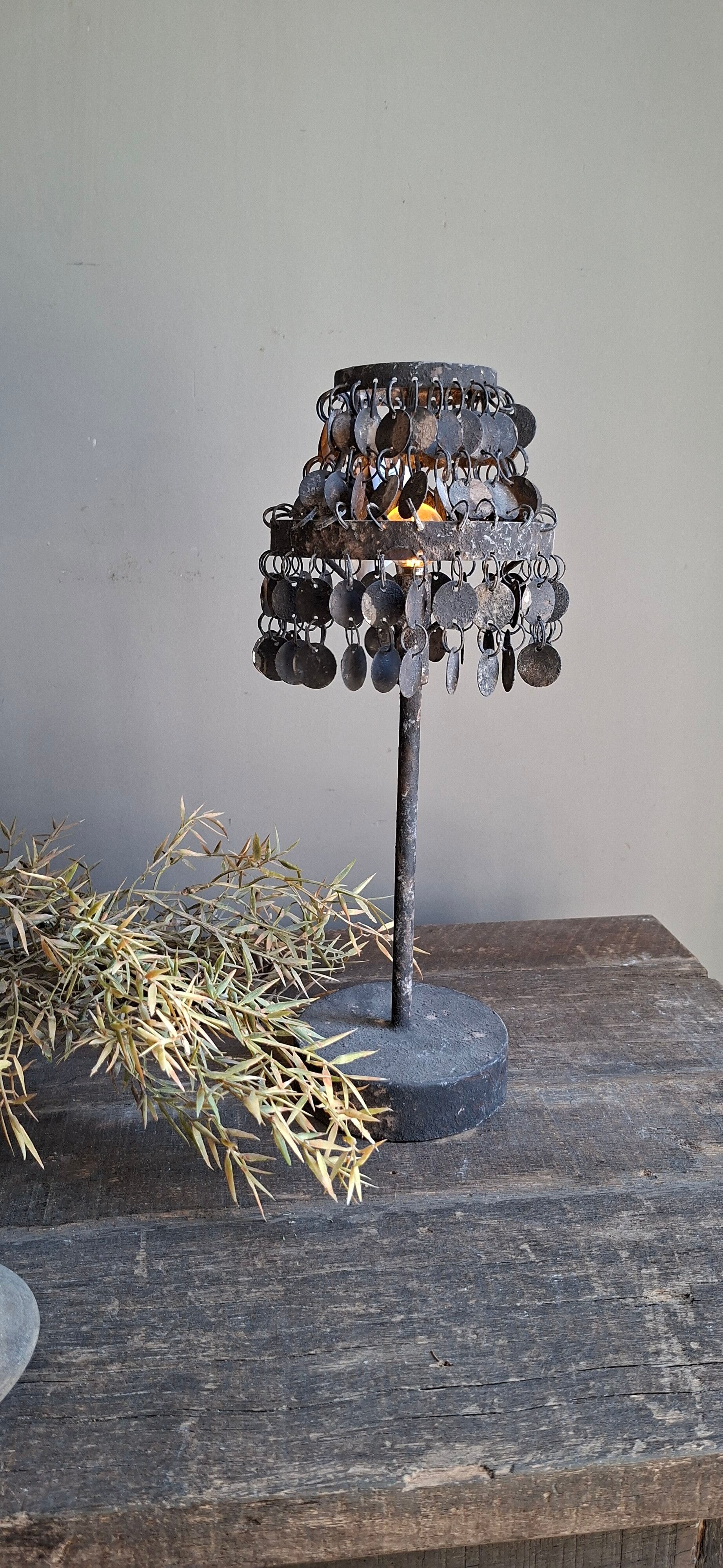 Stoer verweerd grijs/zwart muntjes lampje met timer (brand 6 uur) Het lampje werkt op 2 AA batterijen (niet in begrepen). Prachtig te decoreren met andere stoer sobere woondecoratie.