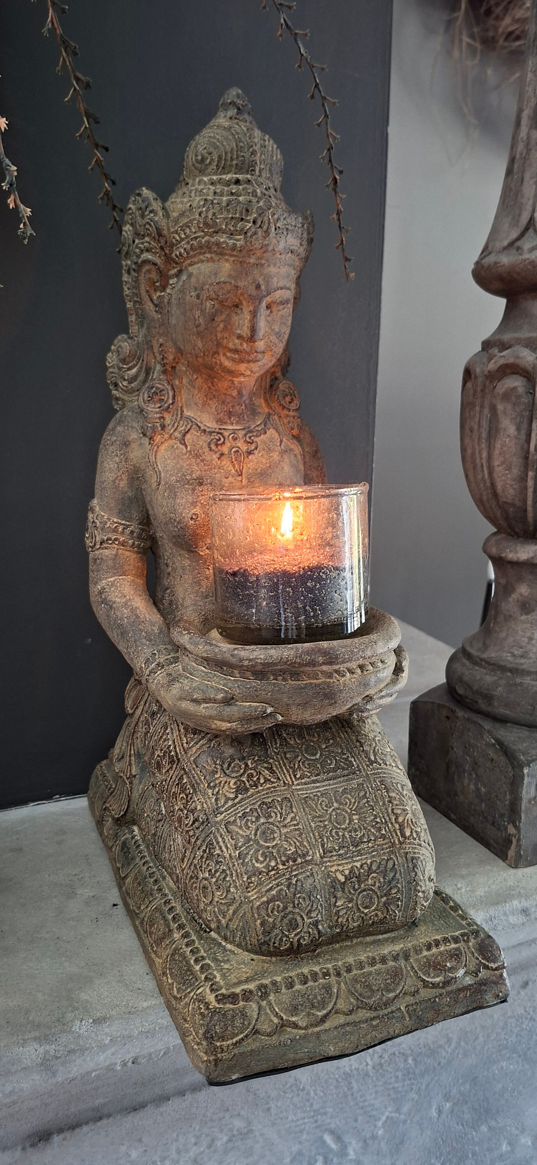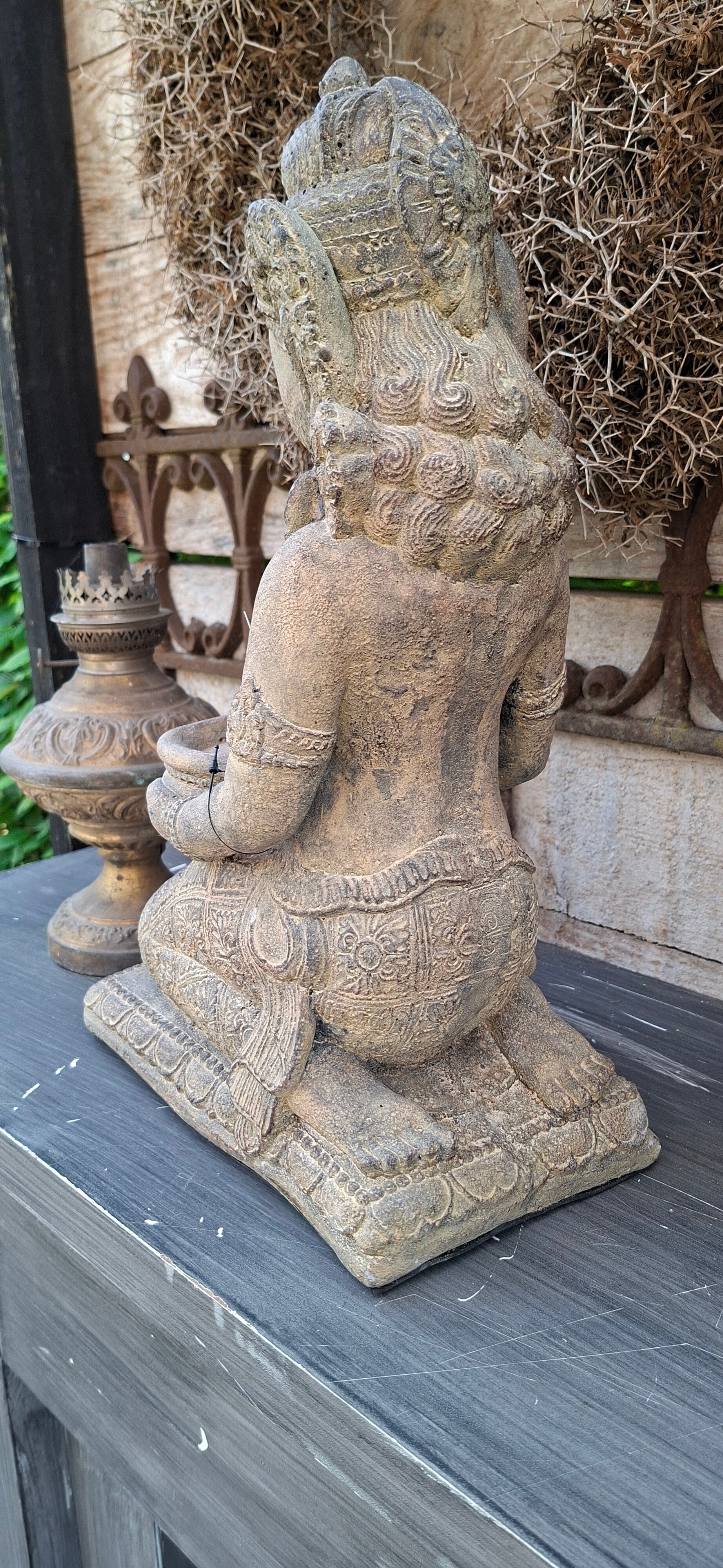Zware gedetailleerde knielende vrouwenlijke Buddha met een mooie bruine kleurschakering, voor buiten onder een overkapping of een mooi plekje in huis. Theelicht niet inbegrepen.