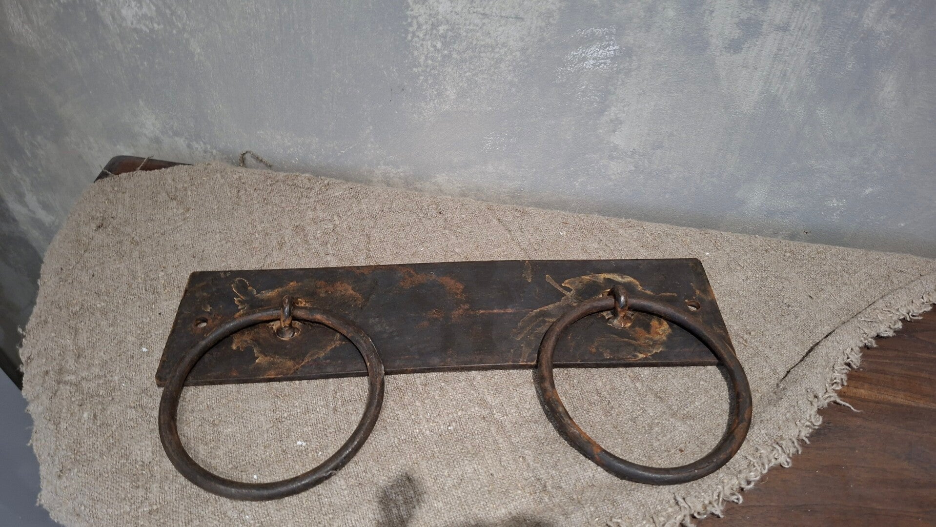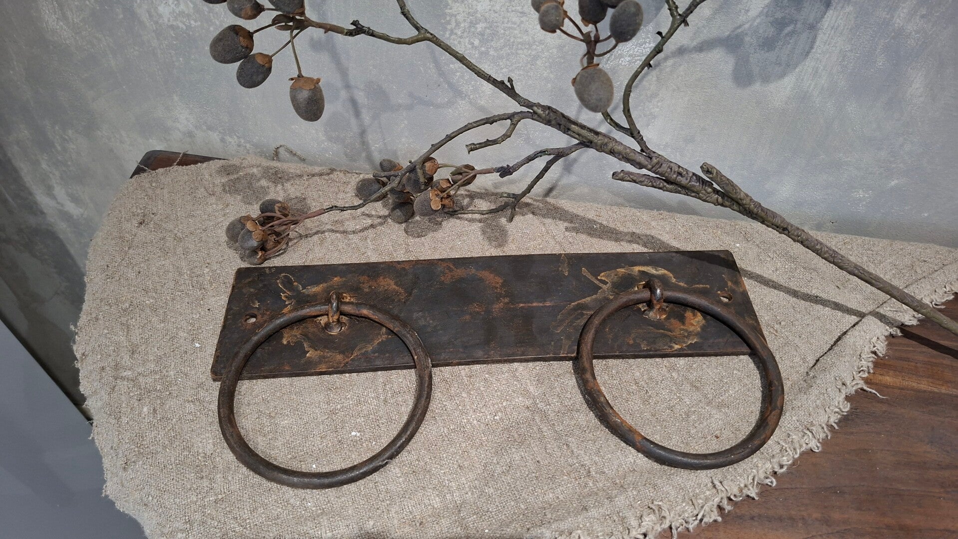 Mooie metalen ringen op plaat, erg mooi in een landelijke keuken voor handdoeken aan te hangen.